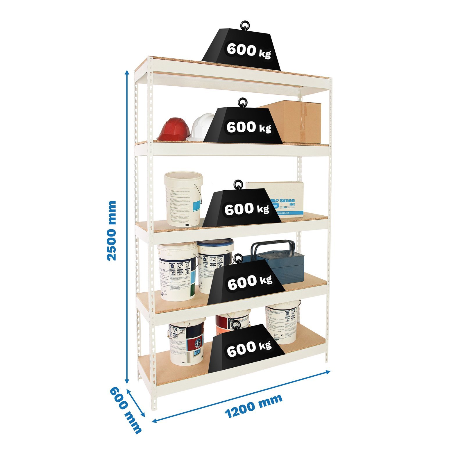 Estanteria media carga sin tornillos, de color blanco con 5 alturas. Tiene una capacidad de carga por estante de 600 kg y una capacidad total de 3000 kgs, certificamos a punto de flexion, no de rotura. Incluye 5 aglomerados. Con unas medidas en mm de 2500x1200x600. Fabricada en Europa por Simonrack y se monta rapido siguiendo las instrucciones