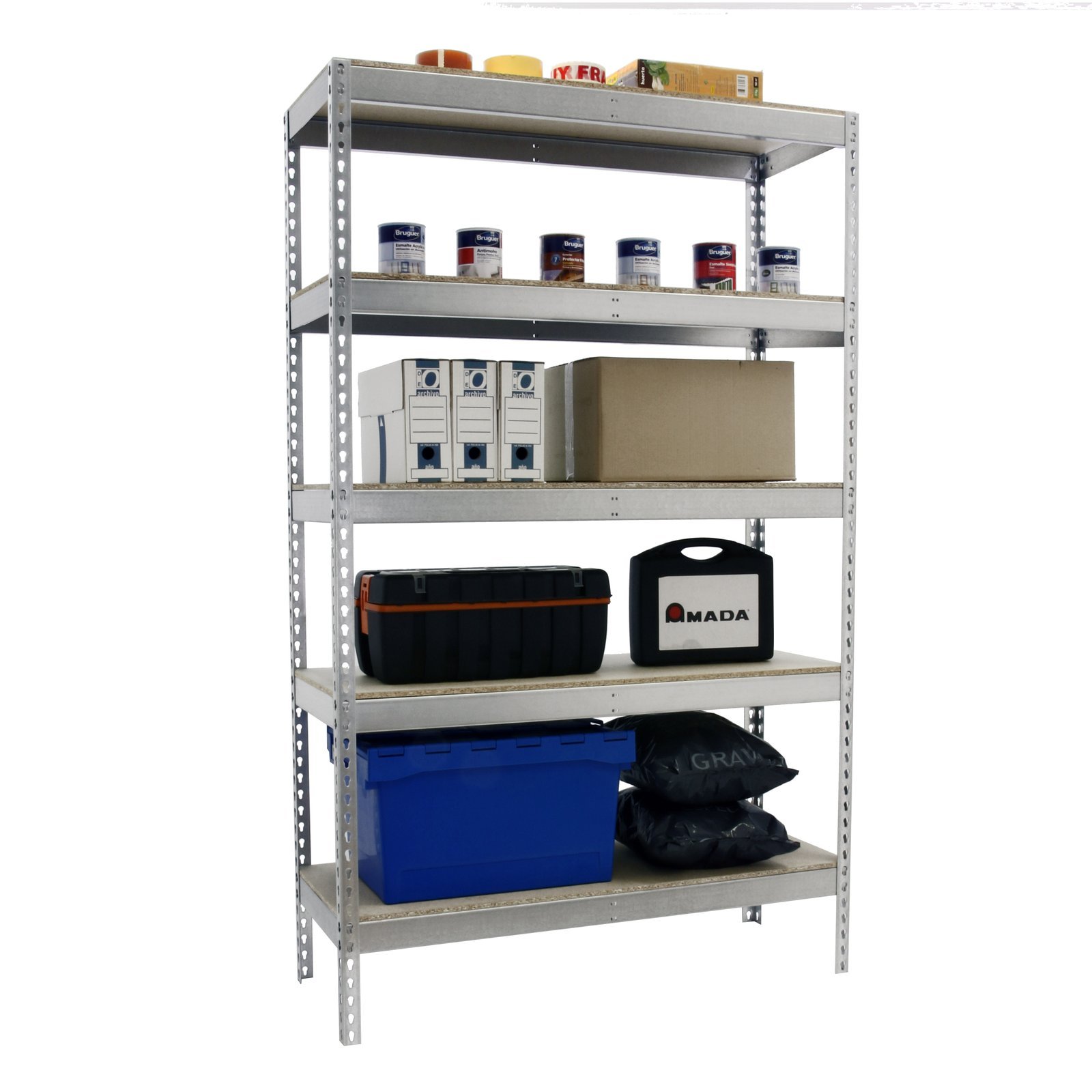 Estanteria media carga sin tornillos de color galva/madera con 5 alturas. Tiene una capacidad de carga por estante de 600 kg y una capacidad total de 3000 kgs, certificamos a punto de flexion, no de rotura. Incluye 5 aglomerados. Con unas medidas en mm de 2500x1200x600. Fabricada en Europa por Simonrack y se monta rapido siguiendo las instrucciones