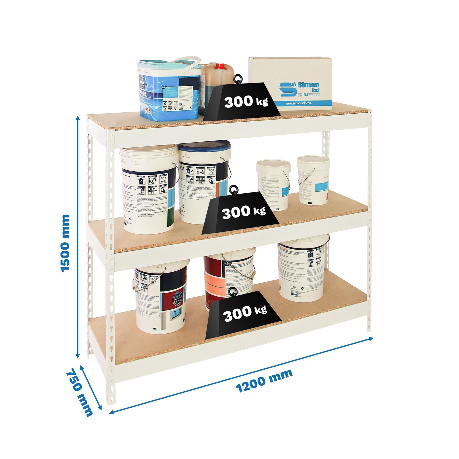 Estanteria media carga sin tornillos, de color blanco con 3 alturas. Tiene una capacidad de carga por estante de 600 kg y una capacidad total de 1800 kgs, certificamos a punto de flexion, no de rotura. Incluye 3 aglomerados. Con unas medidas en mm de 1500x1200x750. Fabricada en Europa por Simonrack y se monta rapido siguiendo las instrucciones
