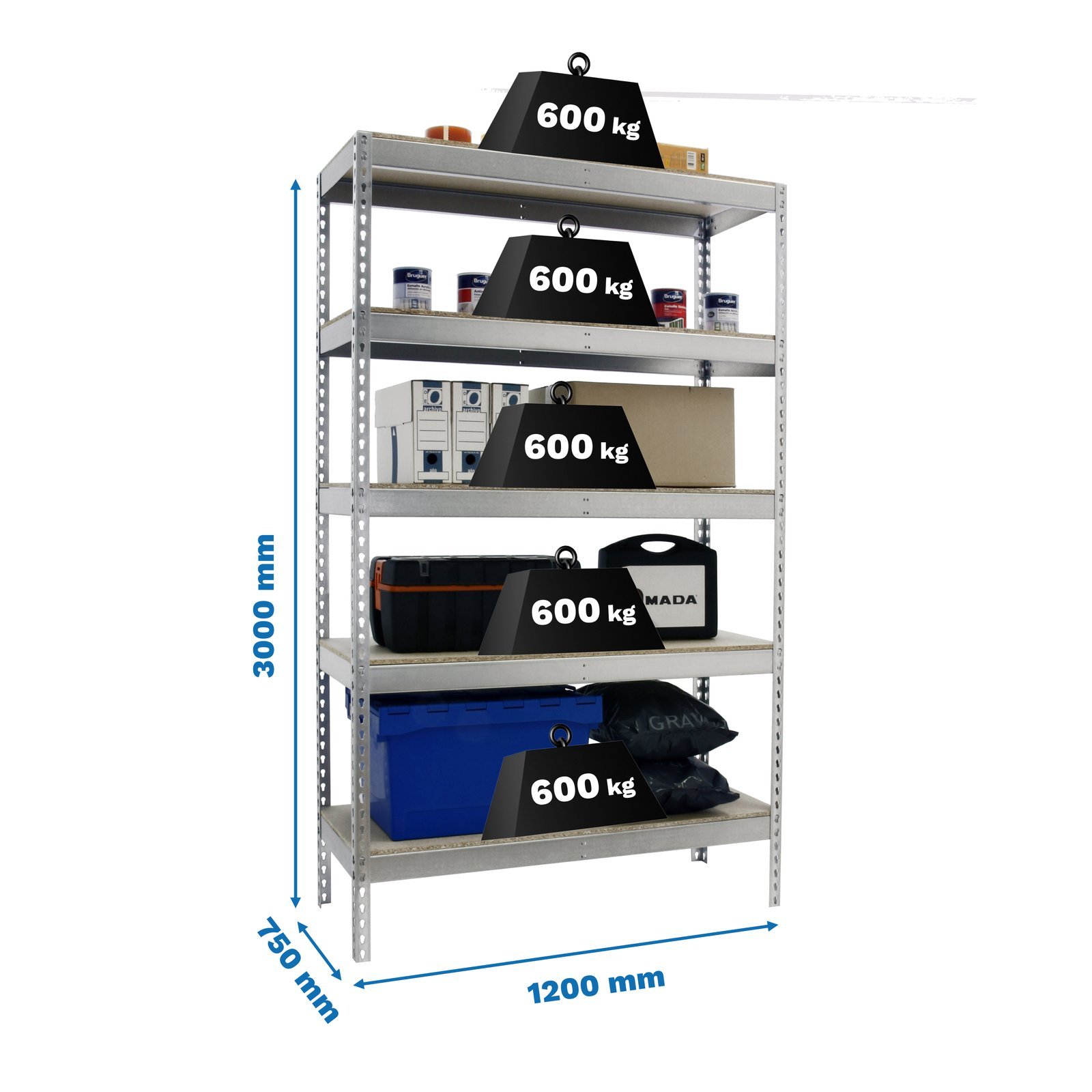 Estanteria media carga sin tornillos de color galva/madera con 5 alturas. Tiene una capacidad de carga por estante de 600 kg y una capacidad total de 3000 kgs, certificamos a punto de flexion, no de rotura. Incluye 5 aglomerados. Con unas medidas en mm de 3000x1200x750. Fabricada en Europa por Simonrack y se monta rapido siguiendo las instrucciones
