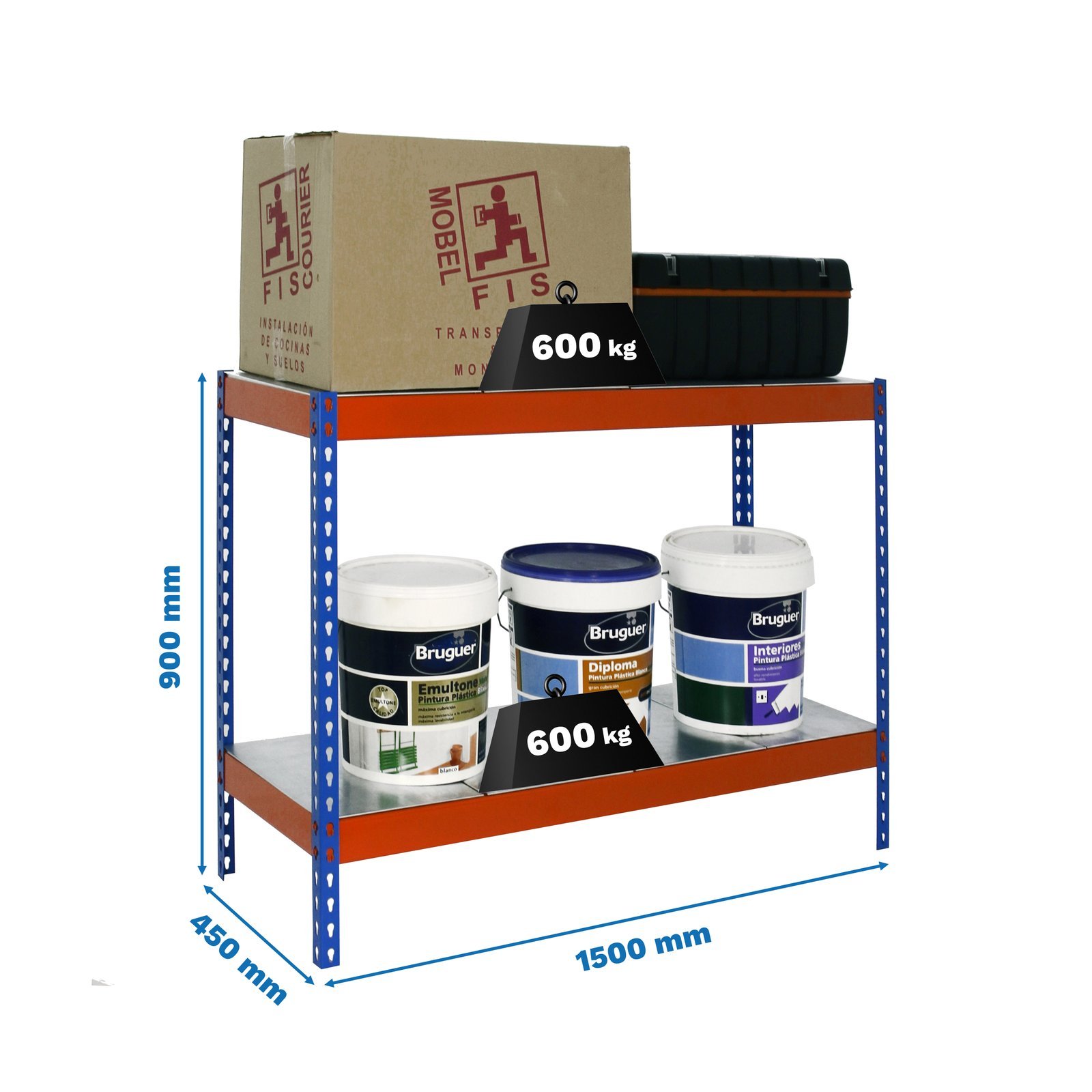 Estanteria media carga sin tornillos de color azul/naranja/galva con 2 estantes metalicos. Tiene una capacidad de carga por estante de 600 kg y una capacidad total de 1200 kgs. Incluye bandejas de metal. Con unas medidas en mm de 900x1500x450. Fabricada en Europa por Simonrack y se monta rapido siguiendo las instrucciones