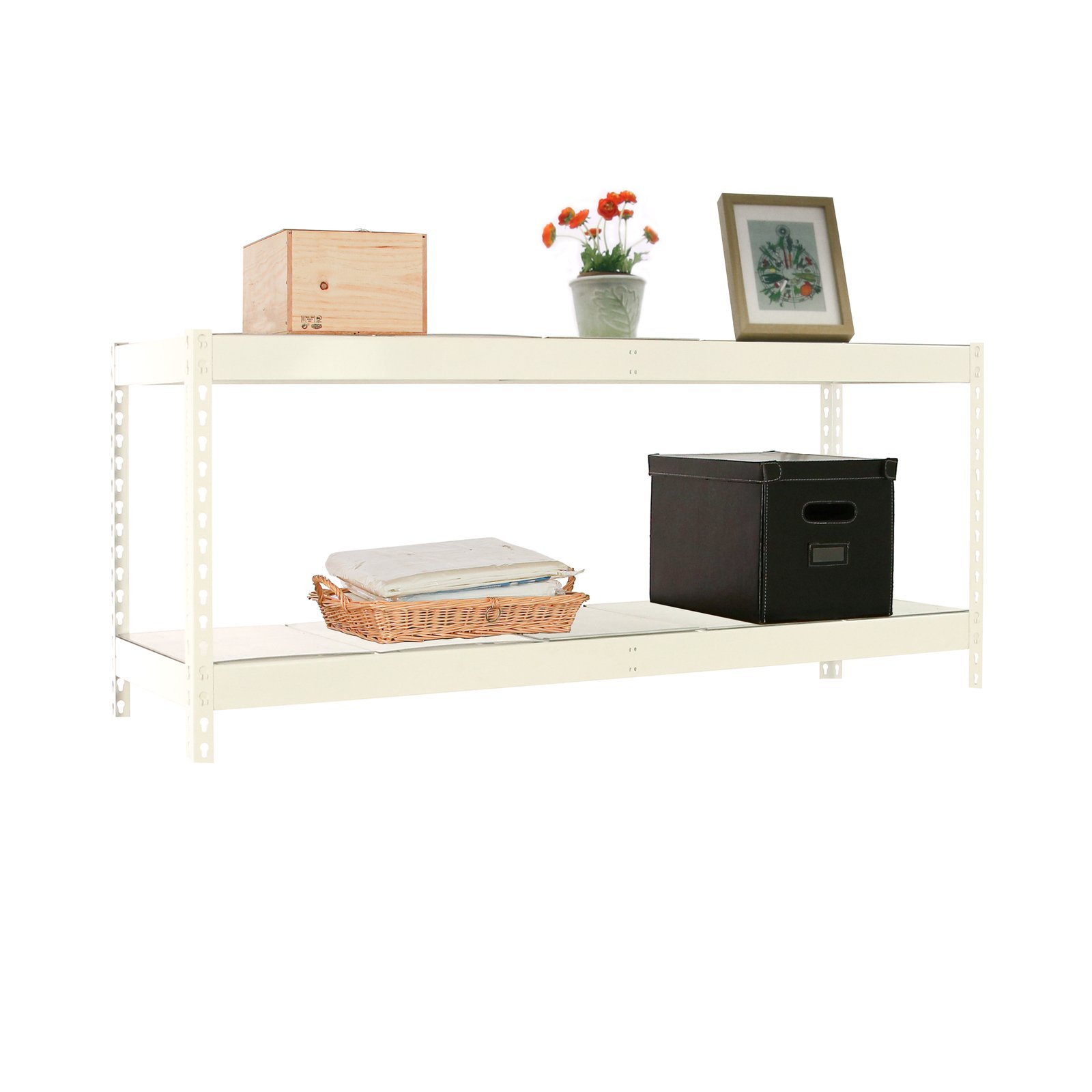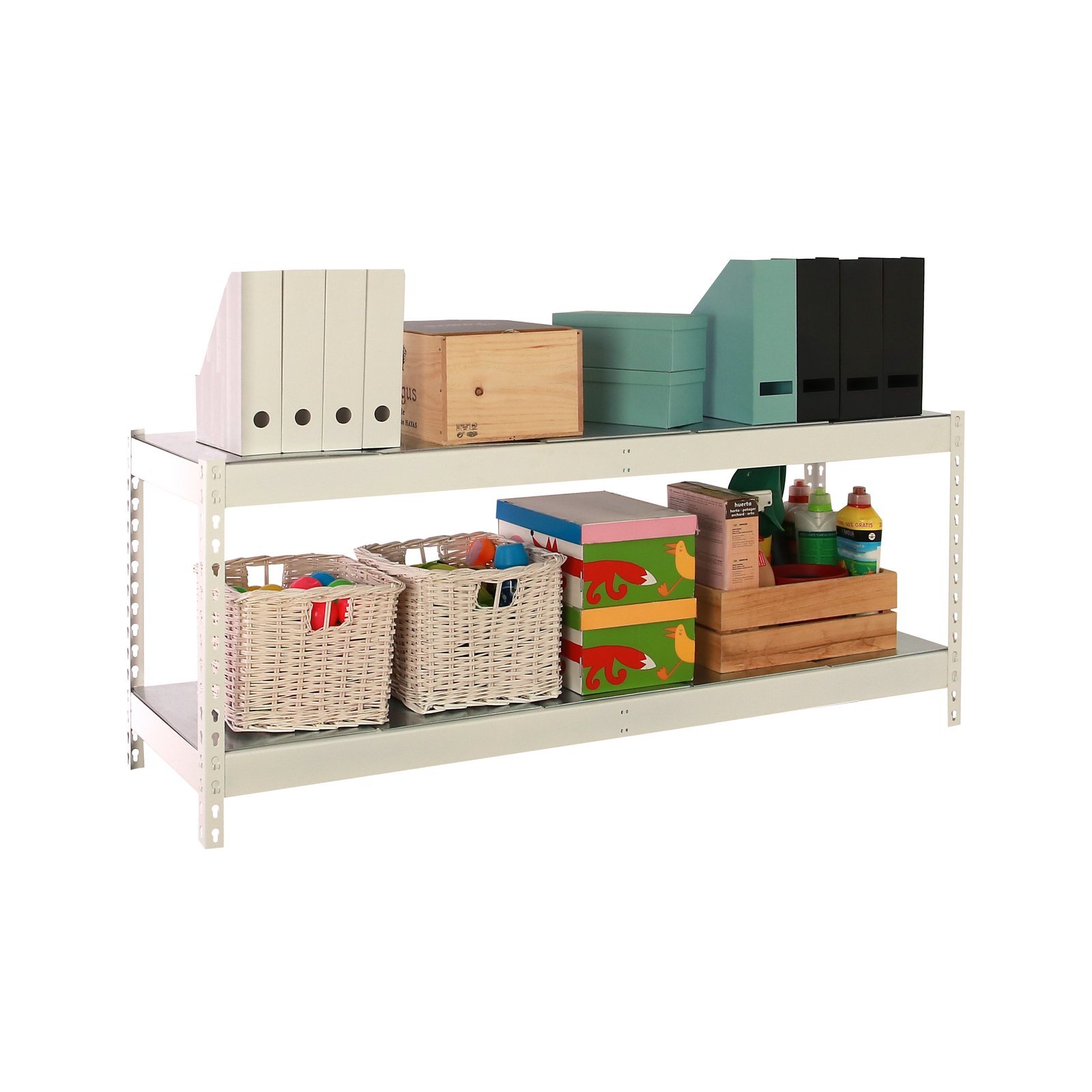 Estanteria media carga sin tornillos, de color blanco con 2 estantes metalicos. Tiene una capacidad de carga por estante de 600 kg y una capacidad total de 1200 kgs. Incluye bandejas de metal. Con unas medidas en mm de 900x1500x450. Fabricada en Europa por Simonrack y se monta rapido siguiendo las instrucciones