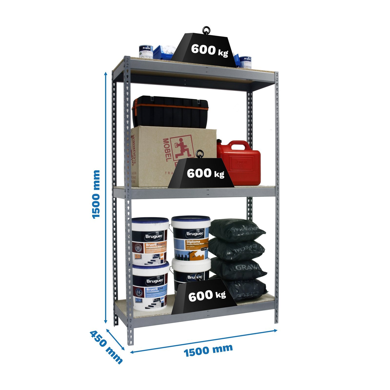 Estanteria media carga sin tornillos de color gris/madera con 3 alturas. Contiene 6 baldas de aglomerado, 2 baldas para cada altura, una de las baldas mas larga que la otra. Tiene una capacidad de carga por estante de 600 kg y una capacidad total de 1800 kgs, certificamos a punto de flexion, no de rotura. Con unas medidas en mm de 1500x1500x450. Fabricada en Europa por Simonrack y se monta rapido siguiendo las instrucciones. Incluye 1 refuerzo por altura