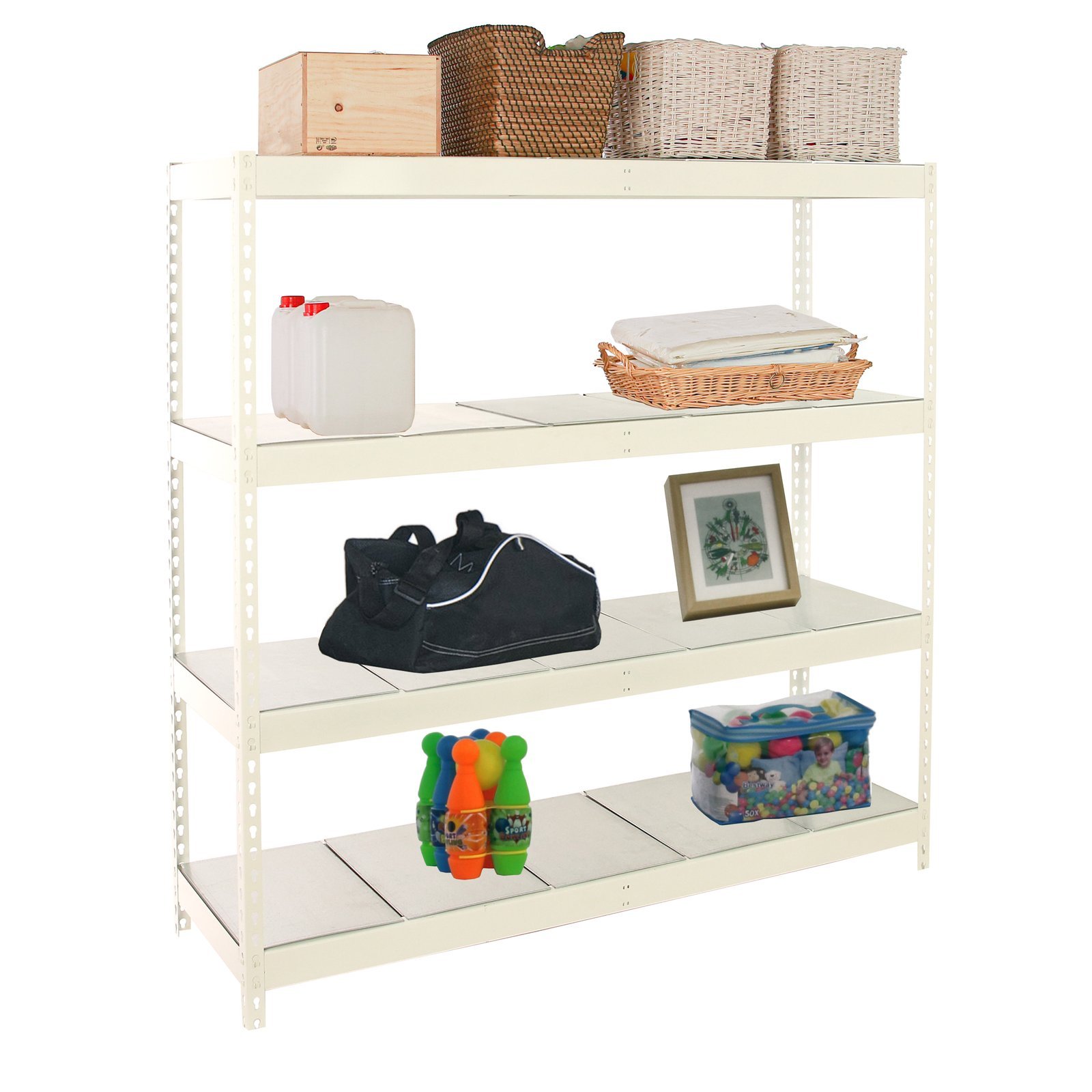 Estanteria metalica sin tornillos, de color blanco con capacidad de carga por estante de 600 kg. El numero de estantes es 4 y las medidas (alto x ancho x fondo) son 2000x1500x450 mm. No incluye estantes. Producto europeo, calidad europea, podras encontrar las instrucciones de montaje en su interior o en este enlace, https, //www. youtube. com/watch?v=p3W9S3LtAqY. Medidas en uso del producto, 1975x1510x460 mm