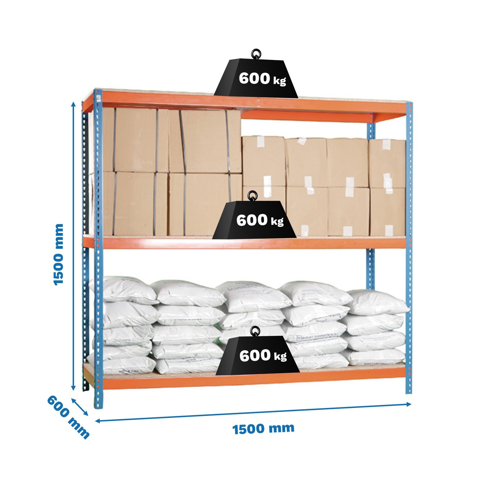 Estanteria media carga sin tornillos de color azul/naranja/madera con 3 alturas. Contiene 6 baldas de aglomerado, 2 baldas para cada altura, una de las baldas mas larga que la otra. Tiene una capacidad de carga por estante de 600 kg y una capacidad total de 1800 kgs, certificamos a punto de flexion, no de rotura. Con unas medidas en mm de 1500x1500x600. Fabricada en Europa por Simonrack y se monta rapido siguiendo las instrucciones. Incluye 1 refuerzo por altura