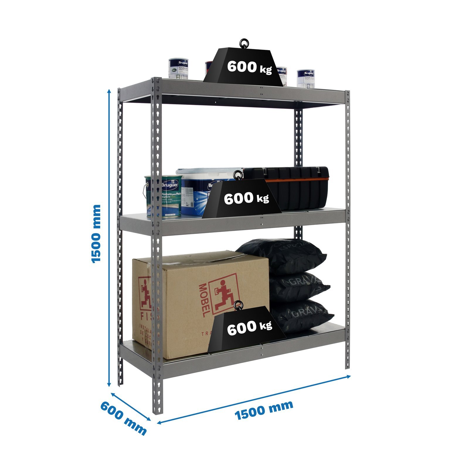 Estanteria media carga sin tornillos de color gris con 3 estantes metalicos. Tiene una capacidad de carga por estante de 600 kg y una capacidad total de 1800 kgs. Incluye bandejas de metal. Con unas medidas en mm de 1500x1500x600. Fabricada en Europa por Simonrack y se monta rapido siguiendo las instrucciones