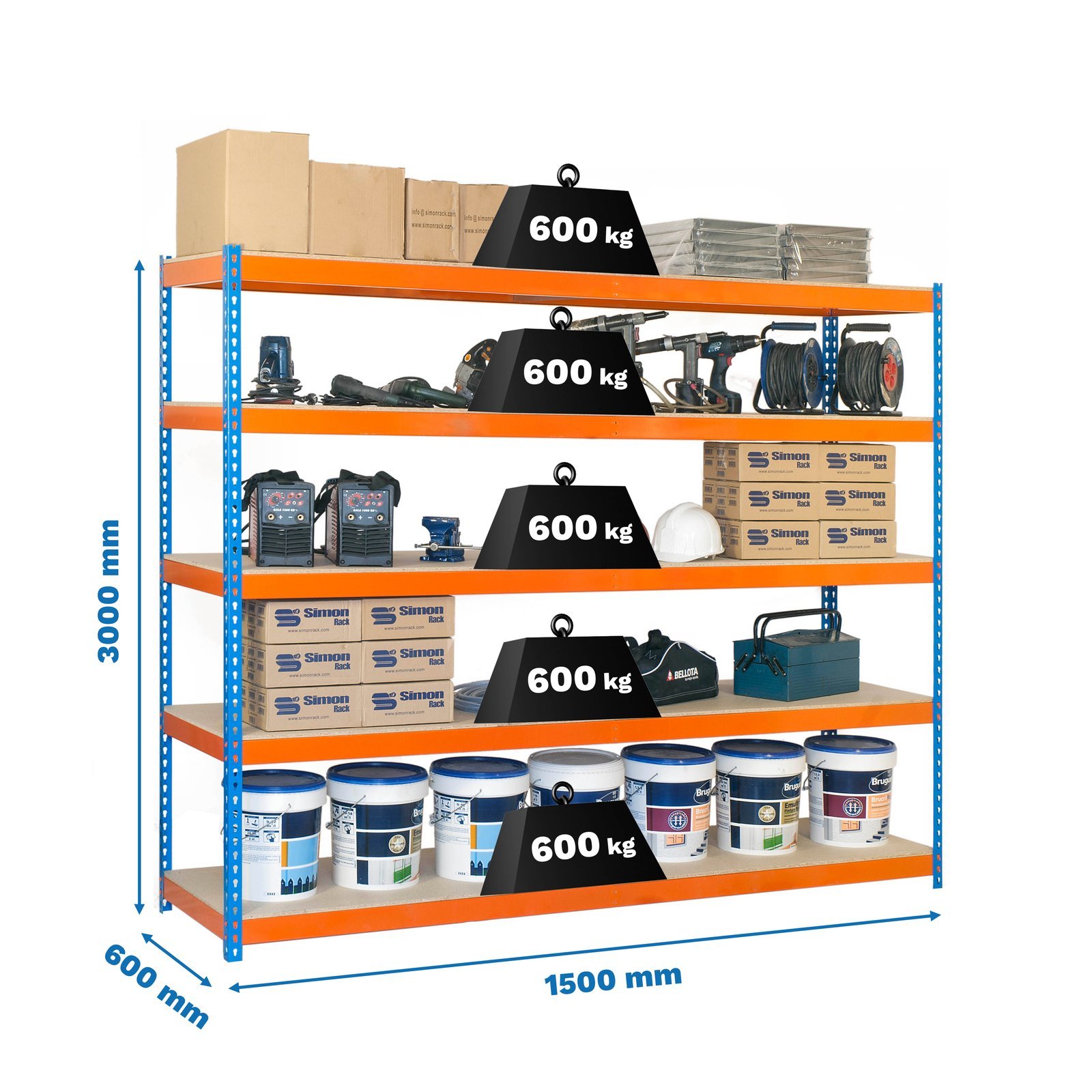 Estanteria media carga sin tornillos de color azul/naranja/madera con 5 alturas. Contiene 10 baldas de aglomerado, 2 baldas para cada altura, una de las baldas mas larga que la otra. Tiene una capacidad de carga por estante de 600 kg y una capacidad total de 3000 kgs, certificamos a punto de flexion, no de rotura. Con unas medidas en mm de 3000x1500x600. Fabricada en Europa por Simonrack y se monta rapido siguiendo las instrucciones. Incluye 1 refuerzo por altura