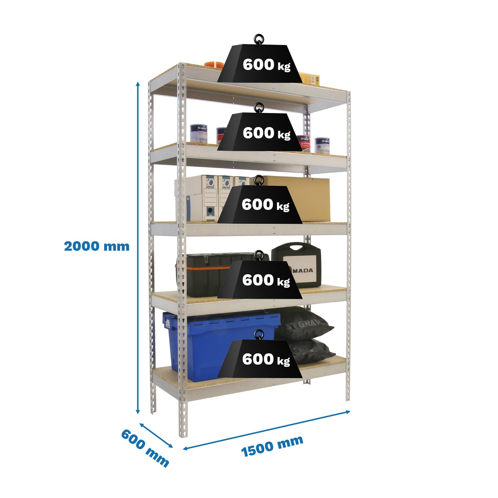 Estanteria metalica sin tornillos de color GALVA/MADERA con capacidad de carga por estante de 600 kg. Tiene 5 alturas. Contiene 10 baldas de aglomerado, 2 baldas para cada altura, una de las baldas mas larga que la otra. Las medidas (alto x ancho x fondo) son 2000x1500x600 mm. Tiene estantes de aglomerado de 12 mm. Producto europeo, calidad europea, podras encontrar las intrucciones de montaje en su interior o en este enlace, https, //www. youtube. com/watch?v=wHCjWzKU_y0. Medidas en uso del producto, 1975x1510x610 mm. Incluye 1 refuerzo por altura