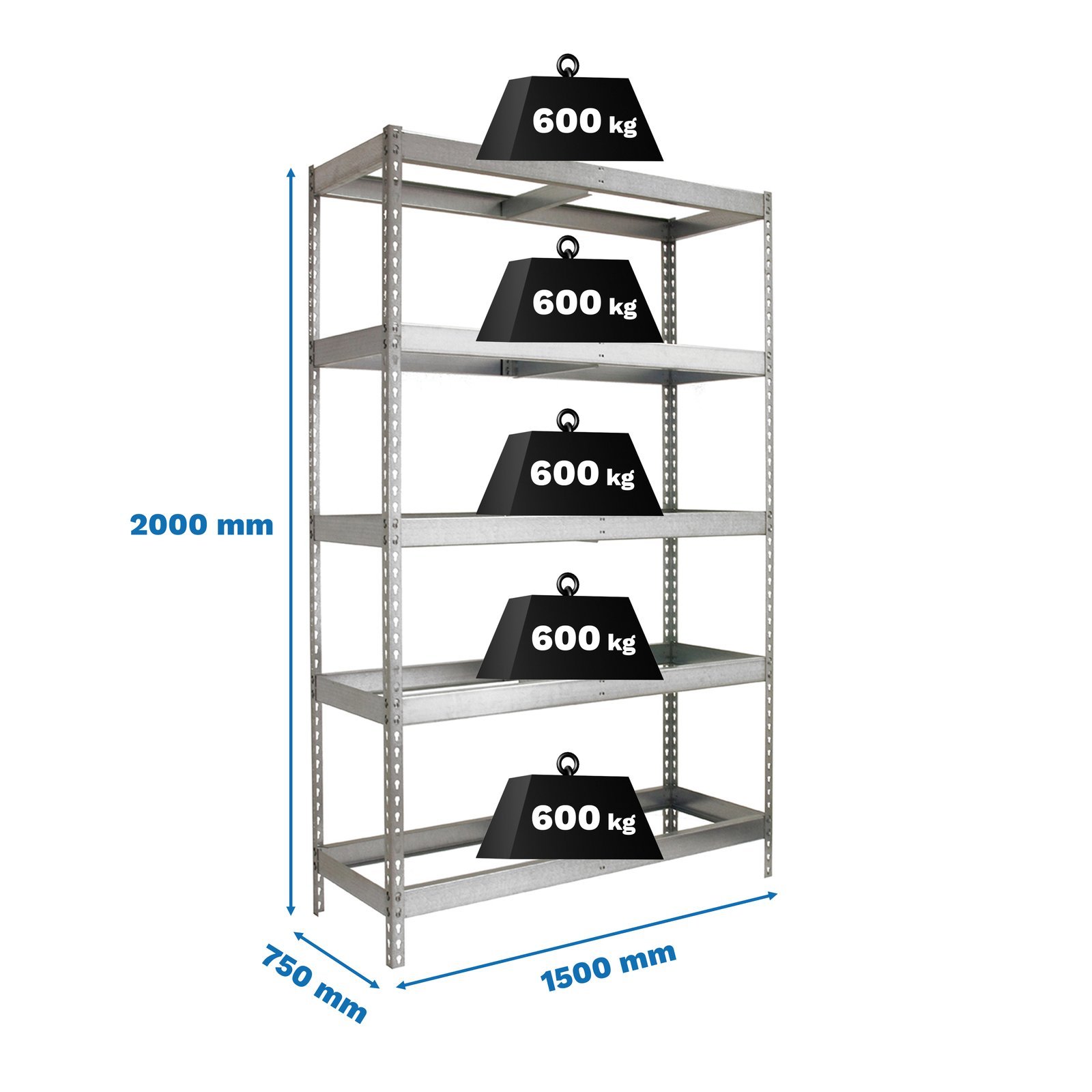 Estanteria metalica sin tornillos con 5 estantes. No contiene ni bandejas de aglomerado ni bandejas de metal. Estanteria que se monta de forma facil y comoda gracias a su sistema de click, sin tornillos simplemente con la ayuda de un martillo podras tener esta estanteria montada en unos minutos. Tienes a tu disposicion un video detallado de montaje en Youtube. La capacidad de carga de cada uno de los estantes es de 600 kgs. Contiene un refuerzo por estante. Contiene un recubrimiento plastico y acaaseo en epoxypoliester. Ademas es muy facil de limpiar. Manipulacion del producto sin aristas de corte, sin riesgos de manipulacion. Es un producto fabricado en Europa por Simonrack. Medidas en uso del producto, 1975x1510x760 mm