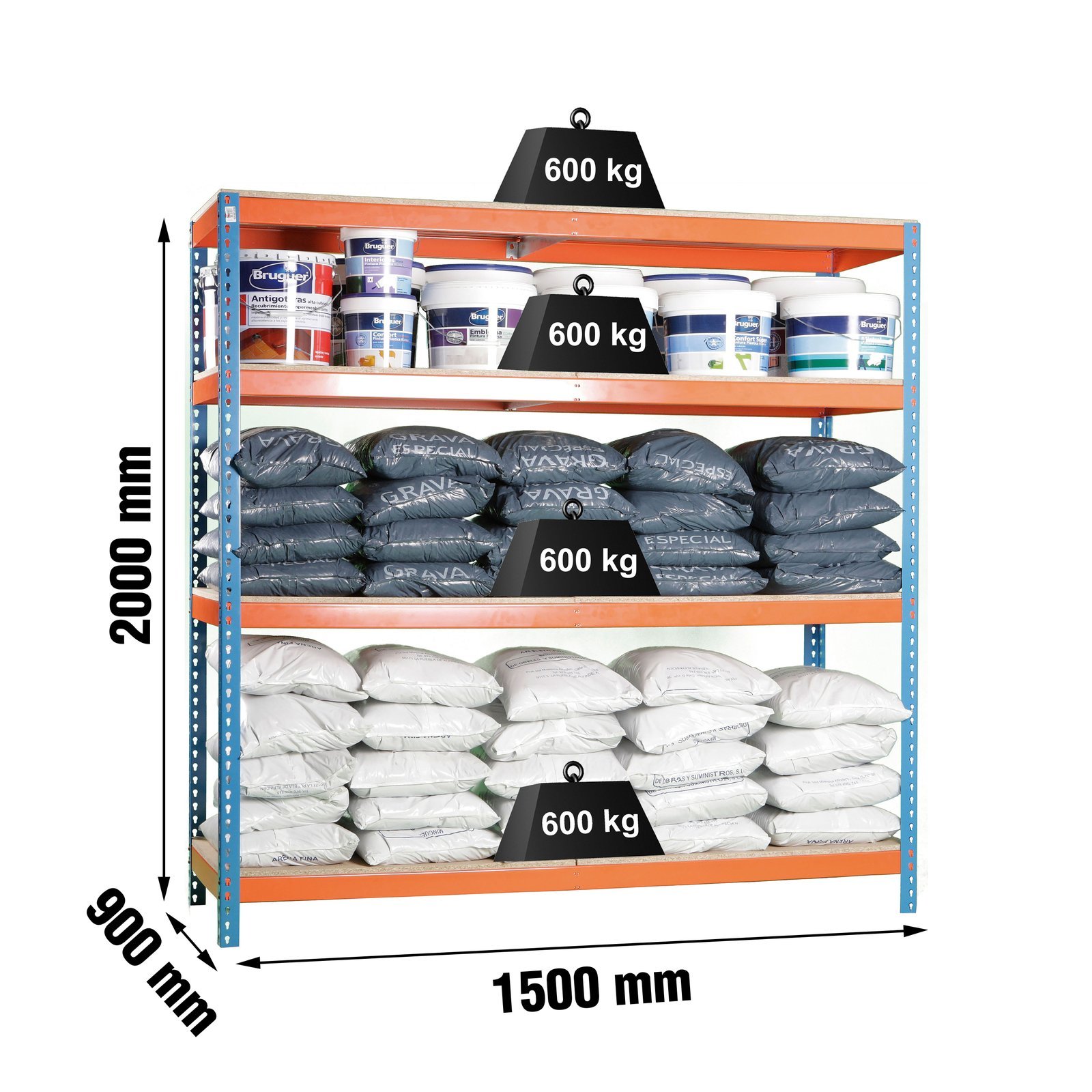 Estanteria metalica sin tornillos de color AZUL/NARANJA/MADERA con capacidad de carga por estante de 600 kg. Tiene 4 alturas. Contiene 8 baldas de aglomerado, 2 baldas para cada altura, una de las baldas mas larga que la otra. Las medidas (alto x ancho x fondo) son 2000x1500x900 mm. Tiene estantes de aglomerado de 12 mm. Producto europeo, calidad europea, podras encontrar las intrucciones de montaje en su interior o en este enlace, https, //www. youtube. com/watch?v=wHCjWzKU_y0. Medidas en uso del producto, 1975x1510x910 mm. Incluye 1 refuerzo por altura