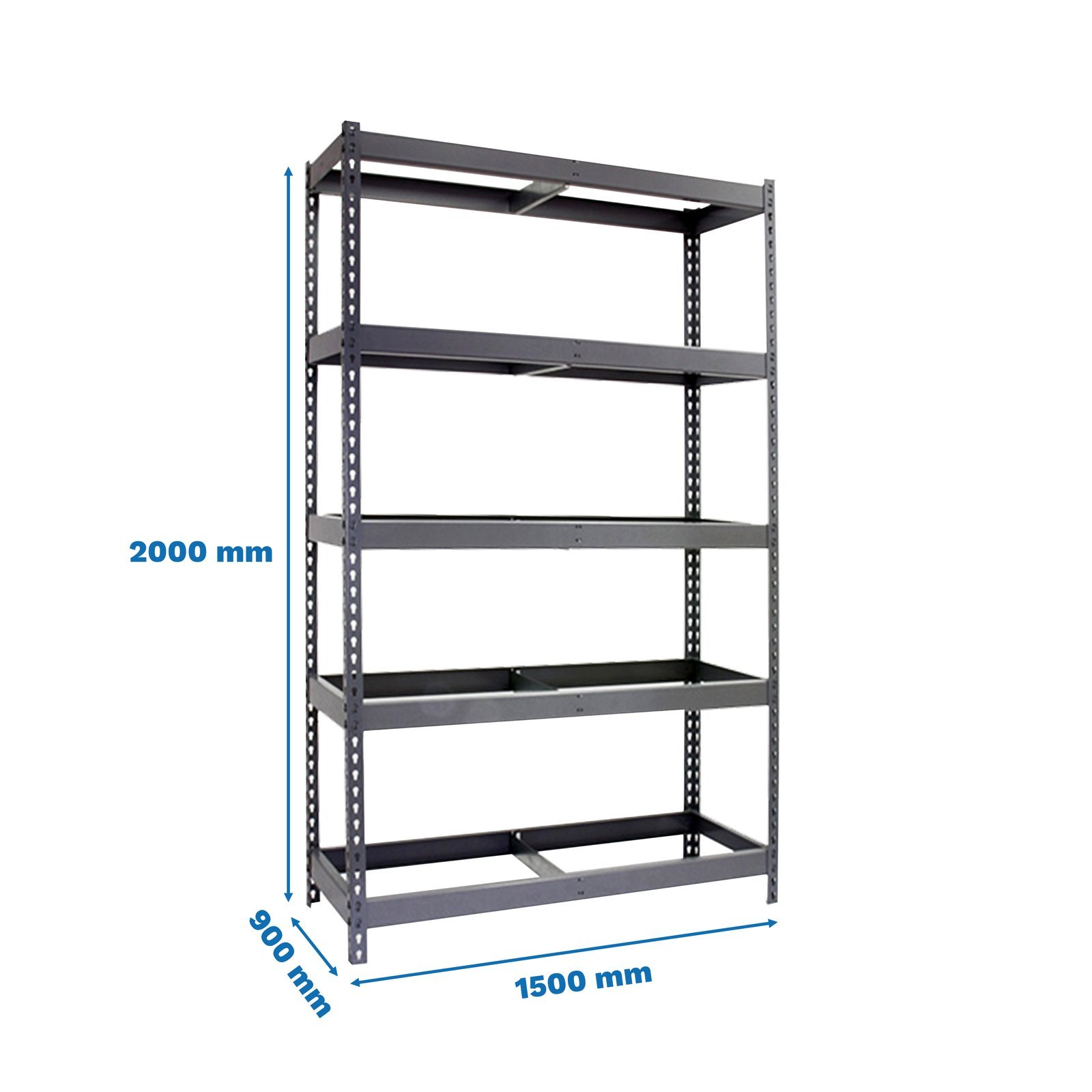 Estanteria metalica en color gris con 5 estante. Tiene una capacidad de carga de 600 kg, certificamos a punto de flexion, no de rotura. No incluye aglomerado ni bandejas de metal. Con unas medidas en mm de 2000x1500x900. Fabricada en Europa por Simonrack y se monta rapido siguiendo las instrucciones
