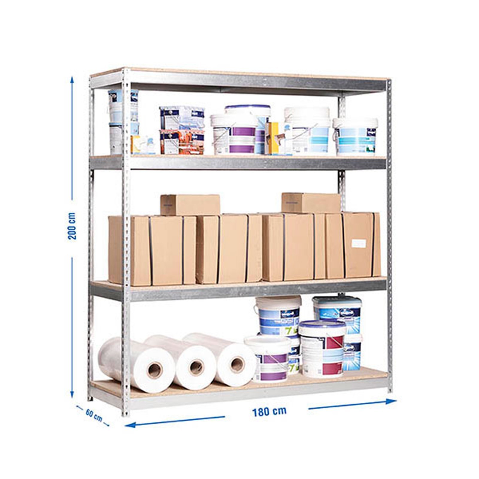 Estanteria metalica sin tornillos de color GALVA/MADERA con capacidad de carga por estante de 600 kg. Tiene 4 alturas. Contiene 8 baldas de aglomerado, 2 baldas para cada altura, una de las baldas mas larga que la otra. Las medidas (alto x ancho x fondo) son 2000x1800x600 mm. Tiene estantes de aglomerado de 12 mm. Producto europeo, calidad europea, podras encontrar las intrucciones de montaje en su interior o en este enlace, https, //www. youtube. com/watch?v=wHCjWzKU_y0. Medidas en uso del producto, 1975x1810x610 mm. Contiene 1 refuerzo por altura