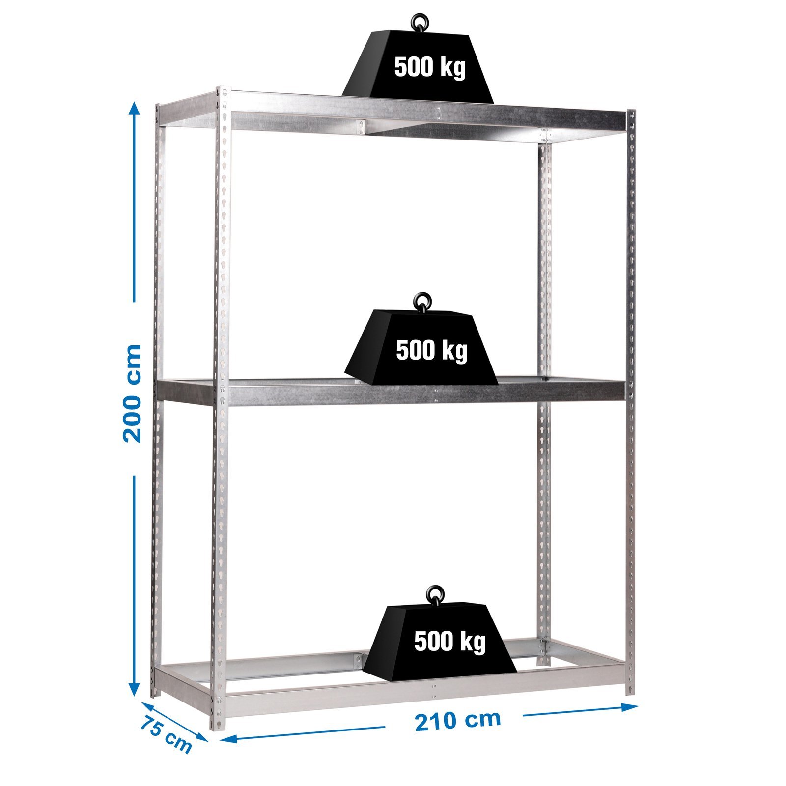 Estanteria metalica sin tornillos con 3 estantes. No contiene ni bandejas de aglomerado ni bandejas de metal. Estanteria que se monta de forma facil y comoda gracias a su sistema de click, sin tornillos simplemente con la ayuda de un martillo podras tener esta estanteria montada en unos minutos. Tienes a tu disposicion un video detallado de montaje en Youtube. La capacidad de carga de cada uno de los estantes es de 500 kgs. Contiene dos refuerzos por estante. Contiene un recubrimiento plastico y acaaseo en epoxypoliester. Ademas es muy facil de limpiar. Manipulacion del producto sin aristas de corte, sin riesgos de manipulacion. Es un producto fabricado en Europa por Simonrack. Medidas en uso del producto, 1975x2110x760 mm