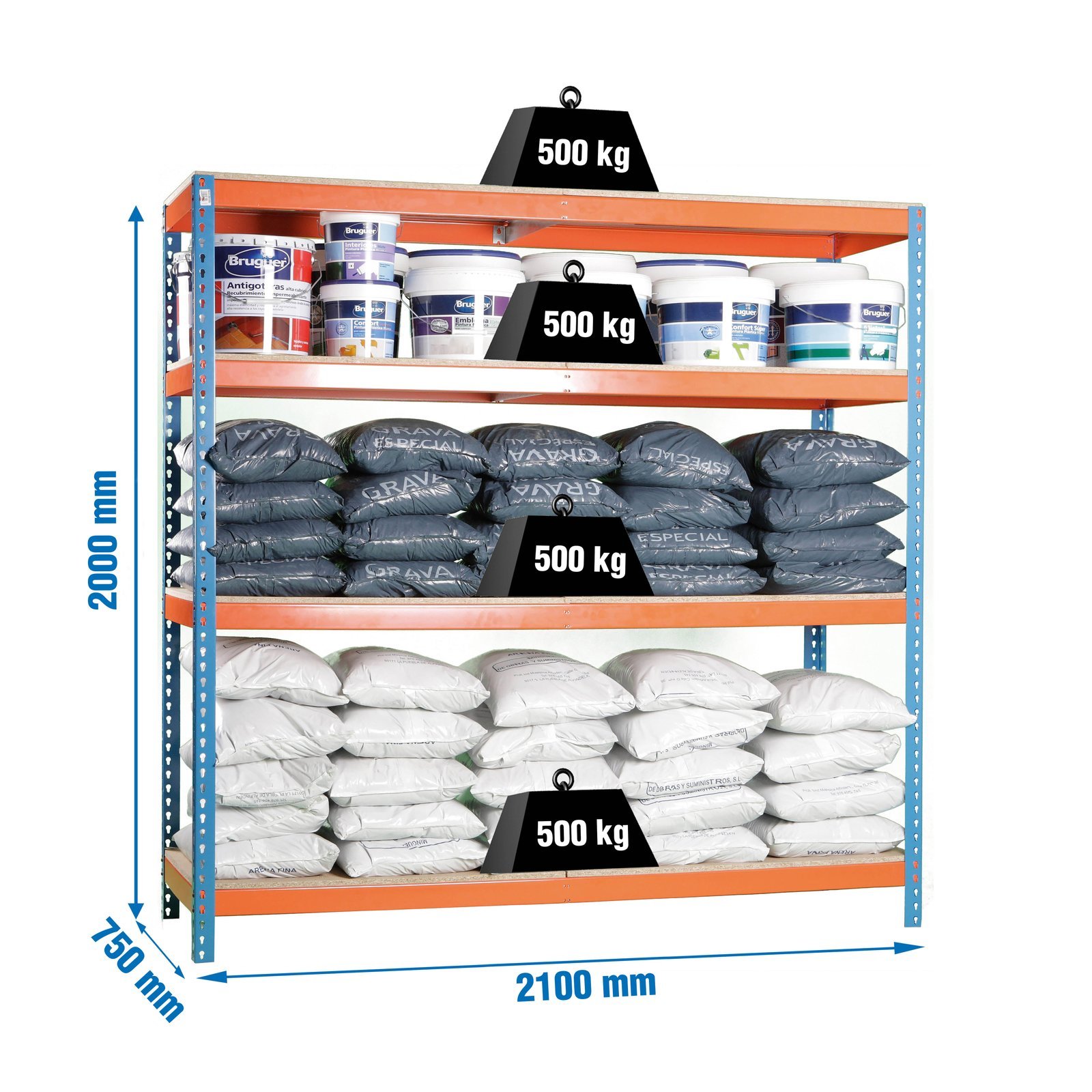 Estanteria metalica sin tornillos de color AZUL/NARANJA/MADERA con capacidad de carga por estante de 500 kg. Tiene 4 alturas. Contiene 8 baldas de aglomerado, 2 baldas para cada altura, una de las baldas mas larga que la otra. Incluye 1 refuerzo por altura. Las medidas (alto x ancho x fondo) son 2000x2100x750 mm. Tiene bandejas de aglomerado de 12 mm. Producto europeo, calidad europea, podras encontrar las intrucciones de montaje en su interior. Medidas en uso del producto, 1975x2110x760 mm