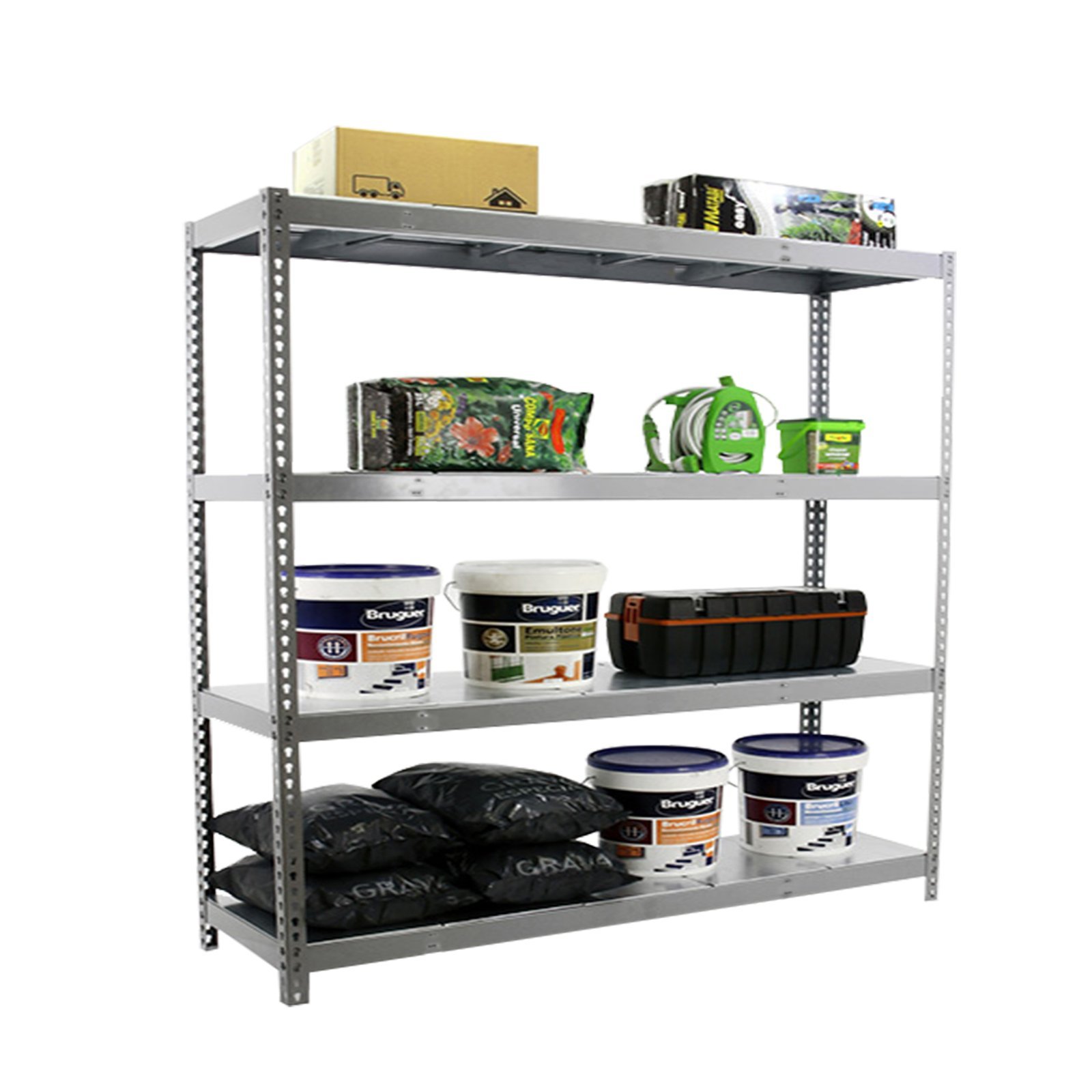 Estanteria media carga sin tornillos de color gris/galva con 4 estantes metalicos. Tiene una capacidad de carga por estante de 400 kg y una capacidad total de 1600 kgs. Incluye bandejas de metal. Con unas medidas en mm de 2000x2400x600. Fabricada en Europa por Simonrack y se monta rapido siguiendo las instrucciones