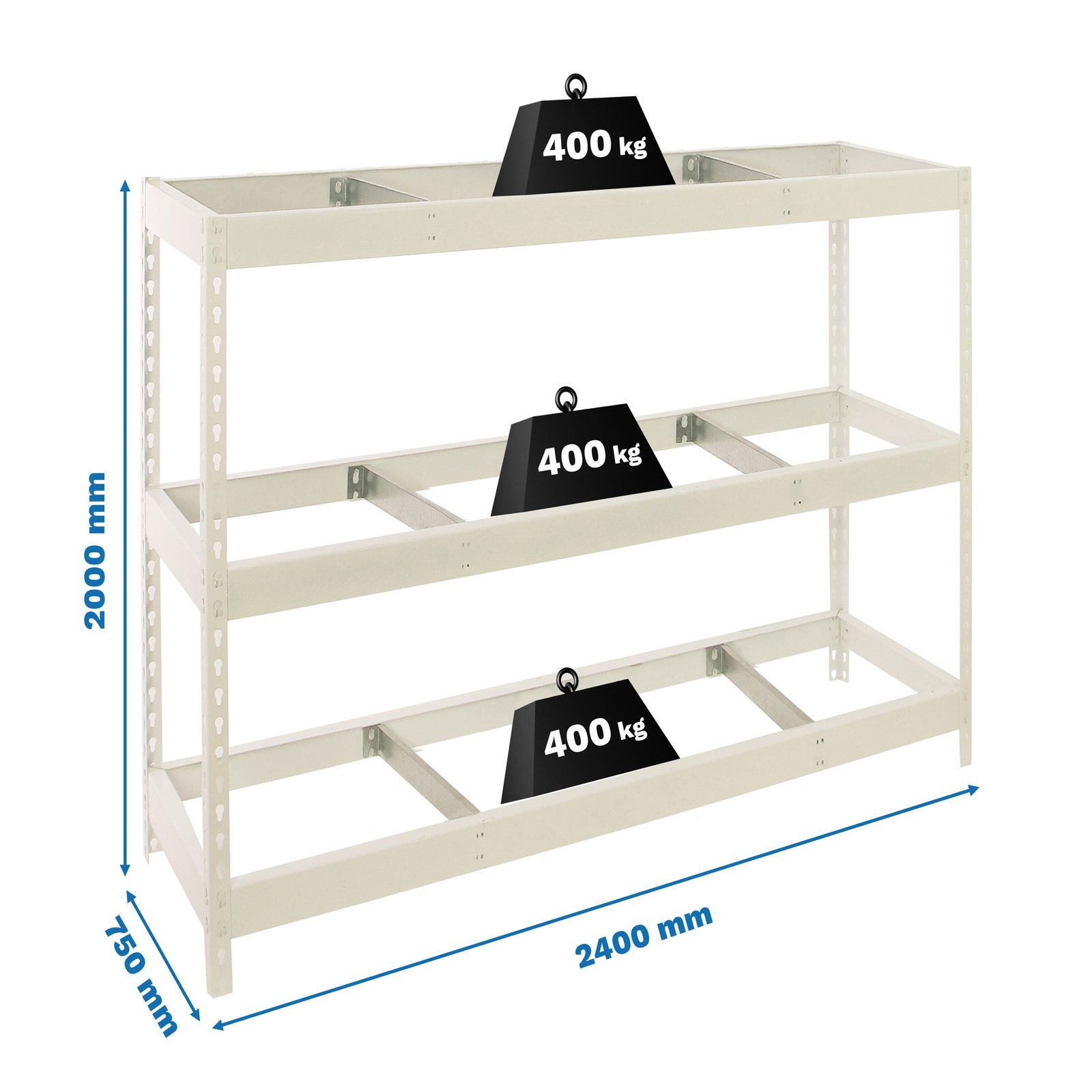 Estanteria metalica sin tornillos con 3 estantes. No contiene ni bandejas de aglomerado ni bandejas de metal. Estanteria que se monta de forma facil y comoda gracias a su sistema de click, sin tornillos simplemente con la ayuda de un martillo podras tener esta estanteria montada en unos minutos. Tienes a tu disposicion un video detallado de montaje en Youtube. La capacidad de carga de cada uno de los estantes es de 400 kgs. Contiene dos refuerzos por estante. Contiene un recubrimiento plastico y acabado en epoxypoliester. Ademas es muy facil de limpiar. Manipulacion del producto sin aristas de corte, sin riesgos de manipulacion. Es un producto fabricado en Europa por Simonrack. Medidas en uso del producto, 1975x2410x760 mm