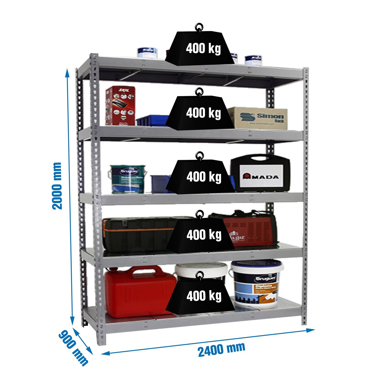 Estanteria media carga sin tornillos de color gris/galva con 5 estantes metalicos. Tiene una capacidad de carga por estante de 400 kg y una capacidad total de 2000 kgs. Incluye bandejas de metal. Con unas medidas en mm de 2000x2400x900. Fabricada en Europa por Simonrack y se monta rapido siguiendo las instrucciones