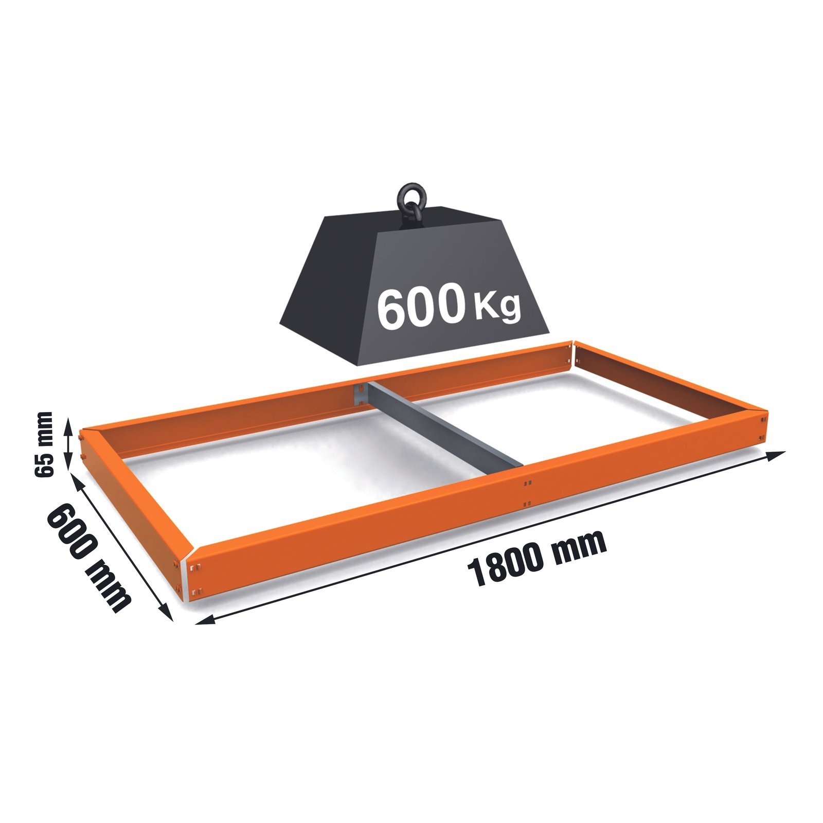 Estante adicional sin tornillos Simonforte de medidas 1800x600x30 mm. De color NARANJA. La capacidad de carga es de 600 kgs, certificamos a punto de flexion, no de rotura. No incluye aglomerado ni bandejas de metal. Medidas en uso del producto, 1810x610x65 mm