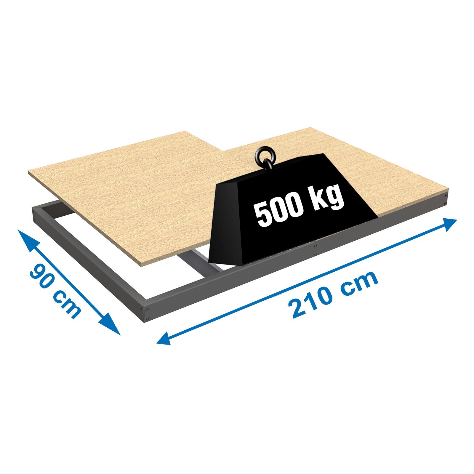Estante adicional sin tornillos. Se monta de forma facil y comoda gracias a su sistema de click, sin tornillos simplemente con la ayuda de un martillo La capacidad de carga es de 500 kgs. Incluye 2 bandejas de aglomerado, una mas larga que la otra. Incluye un refuerzo. Medidas en uso del producto, 2110x910x77 mm