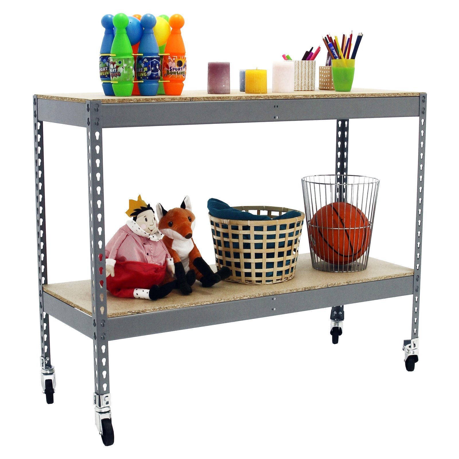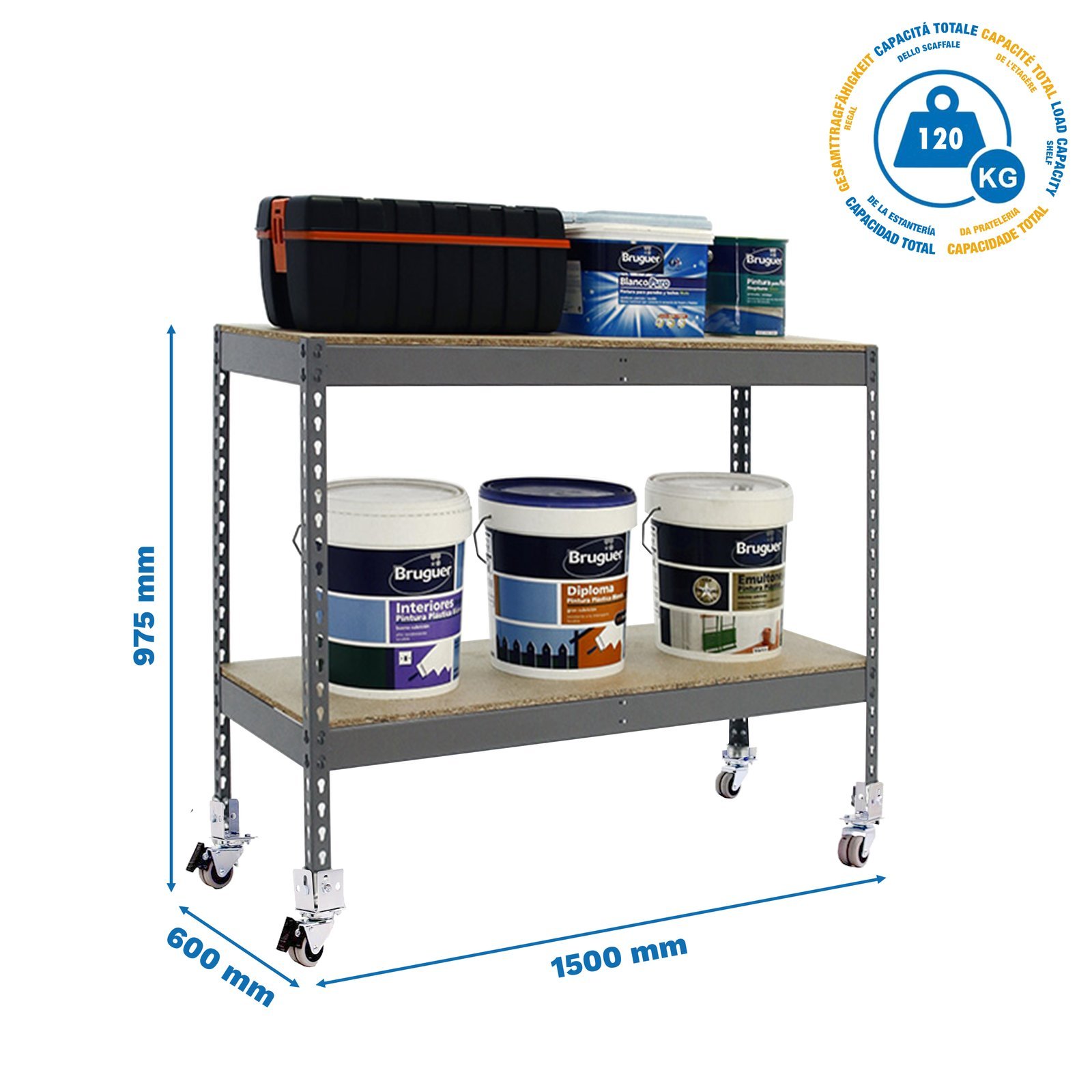 Estanteria media carga sin tornillos de color gris/madera con 2 alturas. Contiene 4 baldas de aglomerado, 2 baldas para cada altura, una de las baldas mas larga que la otra. Con ruedas. Al llevar ruedas, su capacidad de carga total es de 120 kg repartidos de manera uniforme, carga certificada a punto de flexion, no de rotura. Con unas medidas en mm de 900x1500x600. Fabricada en Europa por Simonrack y se monta rapido siguiendo las instrucciones. Incluye 1 refuerzo por altura