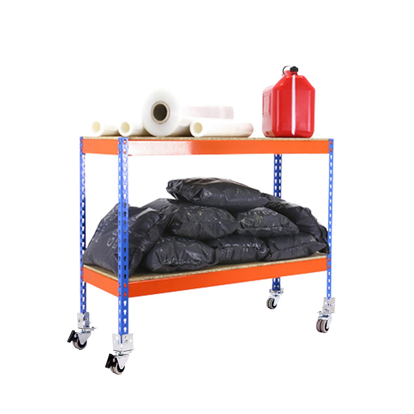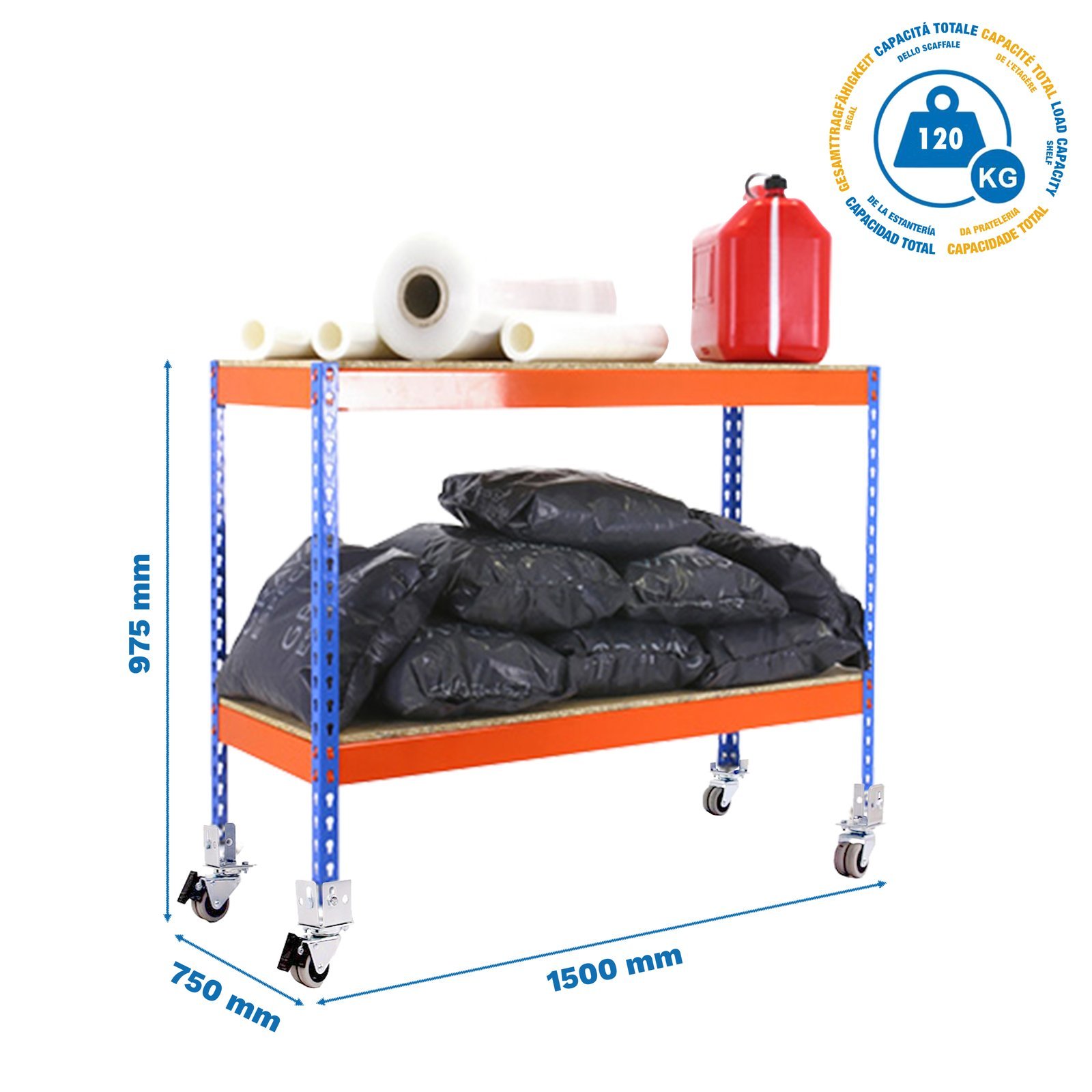 Estanteria media carga sin tornillos de color azul/naranja/madera con 2 alturas. Contiene 4 baldas de aglomerado, 2 baldas para cada altura, una de las baldas mas larga que la otra. Al llevar ruedas, su capacidad de carga total es de 120 kg repartidos de manera uniforme, carga certificada a punto de flexion, no de rotura. Con unas medidas en mm de 900x1500x750. Fabricada en Europa por Simonrack y se monta rapido siguiendo las instrucciones. Incluye 1 refuerzo por altura