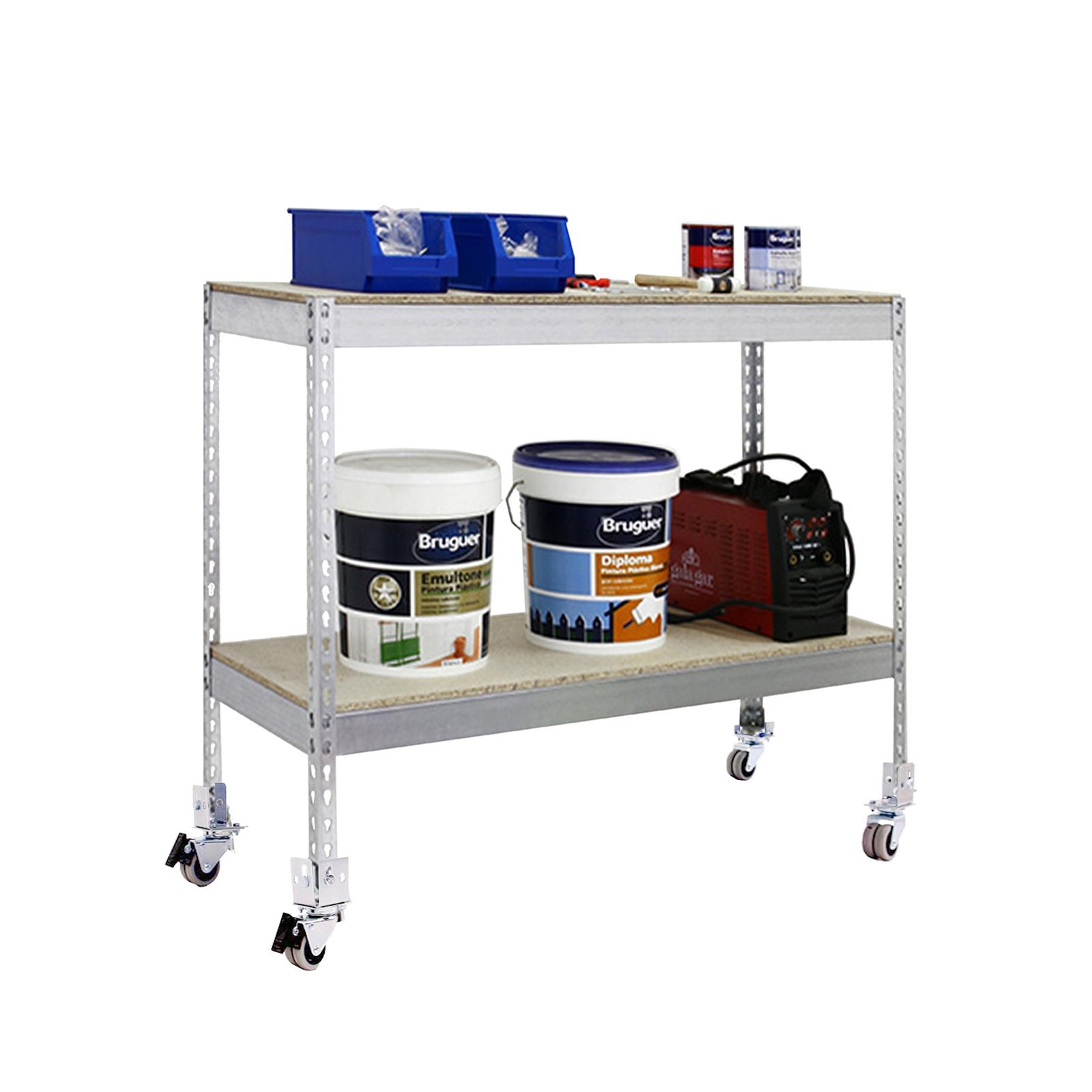 Estanteria media carga sin tornillos de color galva/madera con 2 alturas. Contiene 4 baldas de aglomerado, 2 baldas para cada altura, una de las baldas mas larga que la otra. Al llevar ruedas, su capacidad de carga total es de 120 kg repartidos de manera uniforme, carga certificada a punto de flexion, no de rotura. Con unas medidas en mm de 900x1500x750. Fabricada en Europa por Simonrack y se monta rapido siguiendo las instrucciones. Incluye 1 refuerzo por altura