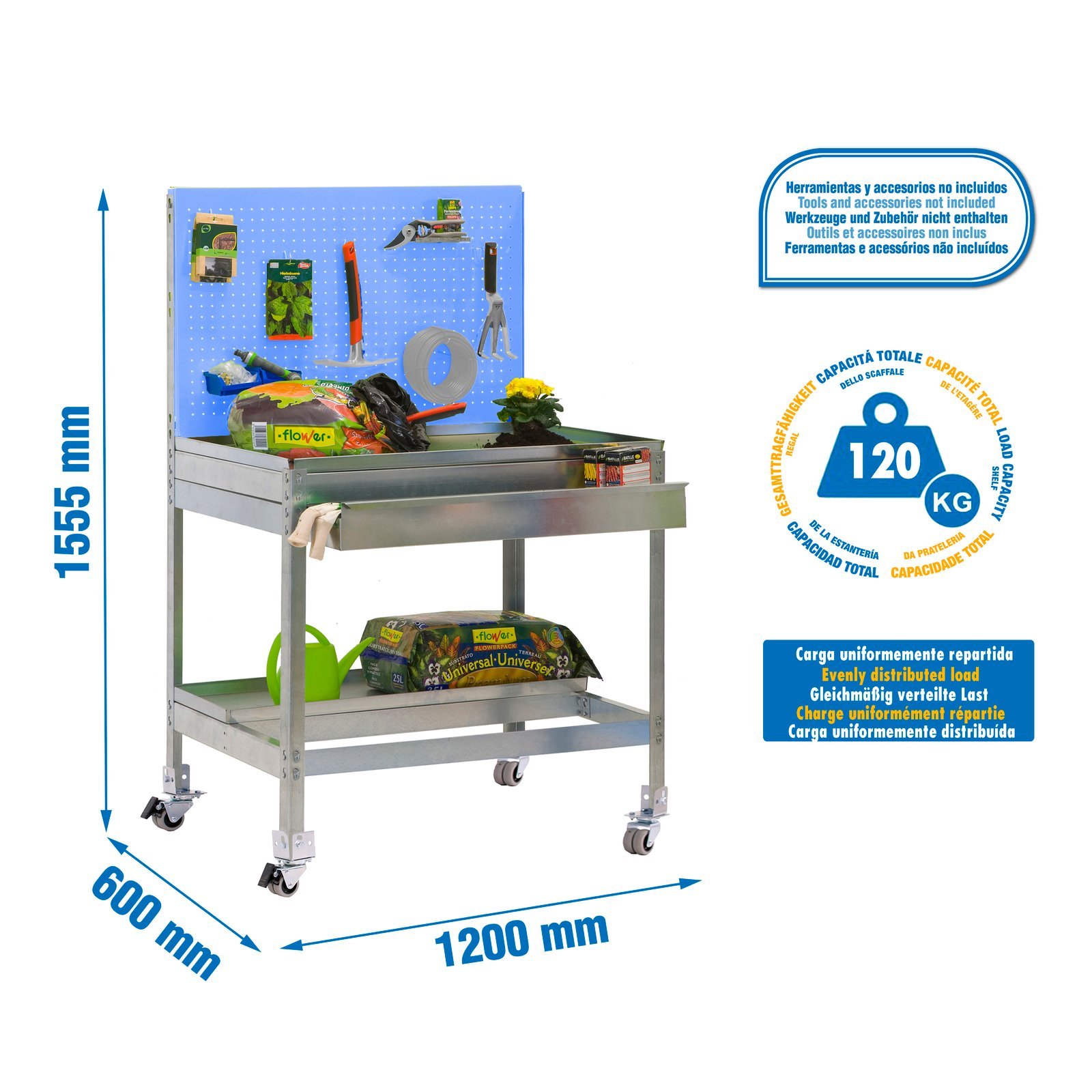 Banco de trabajo perfecto para el jardin y sus cuidados. No necesita anclaje a la pared. Es un banco de trabajo con un panel donde colocar herramientas y accesorios para una mejor organizacion del banco de trabajo. Tiene un grosor de MDF de 16 mm (0. 6). Al llevar ruedas la capacidad de carga es de 120kgs en total. Nuevo packaging en caja. Montaje sin tornillos. Se le a ade un cajon que aguanta hasta 35 kgs, va con guias telescopicas para un manejo mas comodo del usuario. Color del producto AZUL/GALVANIZADO. Dimensiones 1440x1200x60. N estantes 2