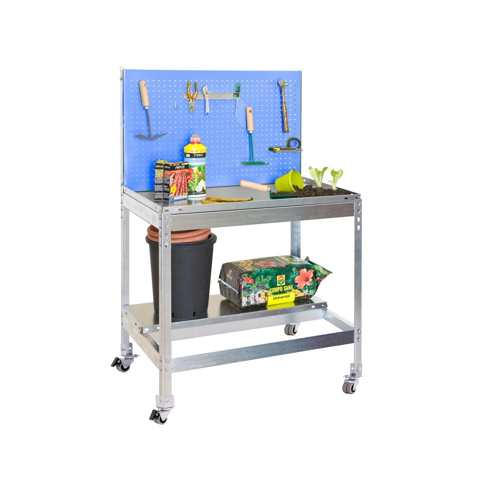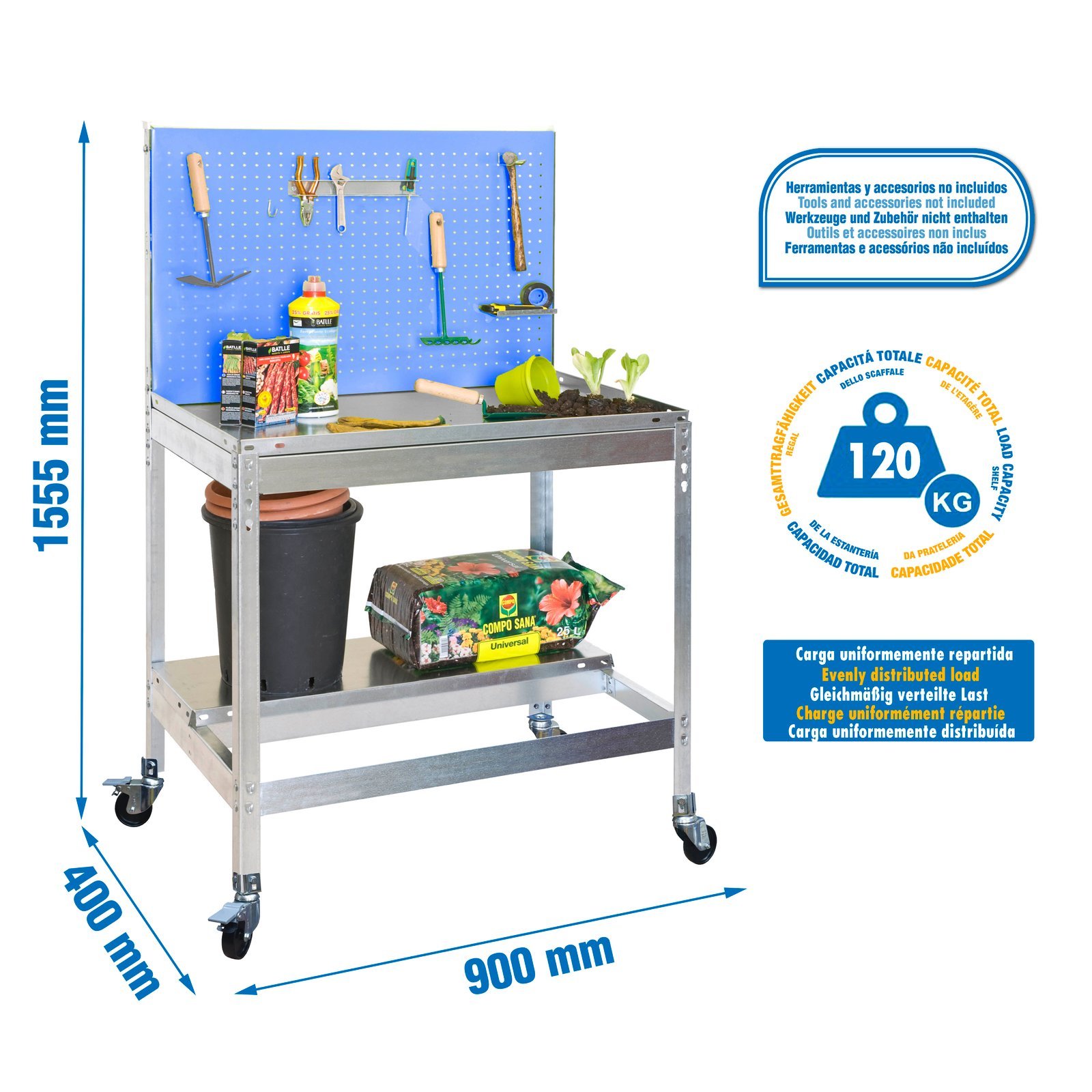 Banco de trabajo perfecto para el jardin y sus cuidados. No necesita anclaje a la pared. Es un banco de trabajo con un panel donde colocar herramientas y accesorios para una mejor organizacion del banco de trabajo. Tiene un grosor de MDF de 16 mm (0. 6). Al llevar ruedas la capacidad de carga es de 120kgs en total. Nuevo packaging en caja. Montaje sin tornillos. Color del producto AZUL/GALVANIZADO. Dimensiones 1440x900x400. N estantes 2