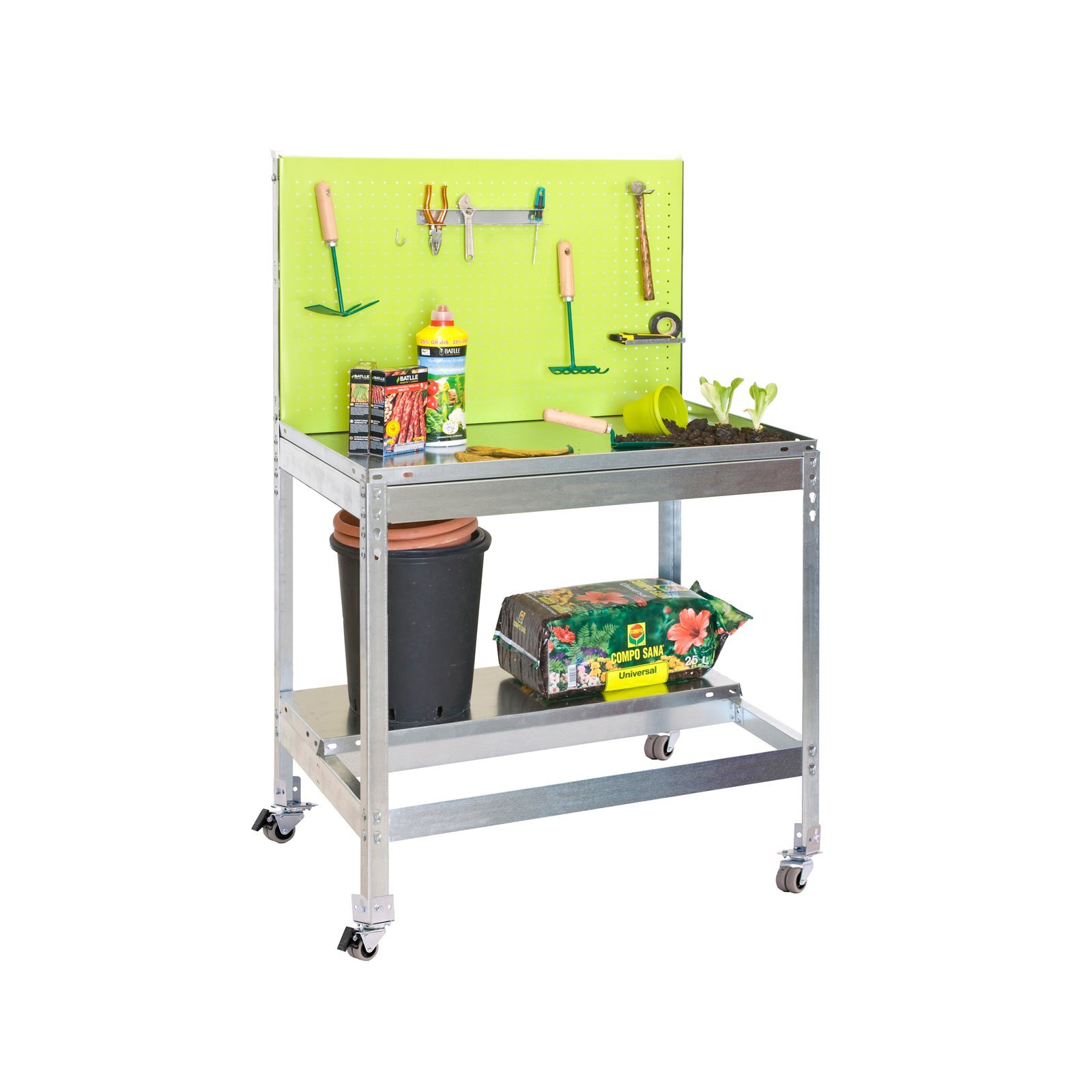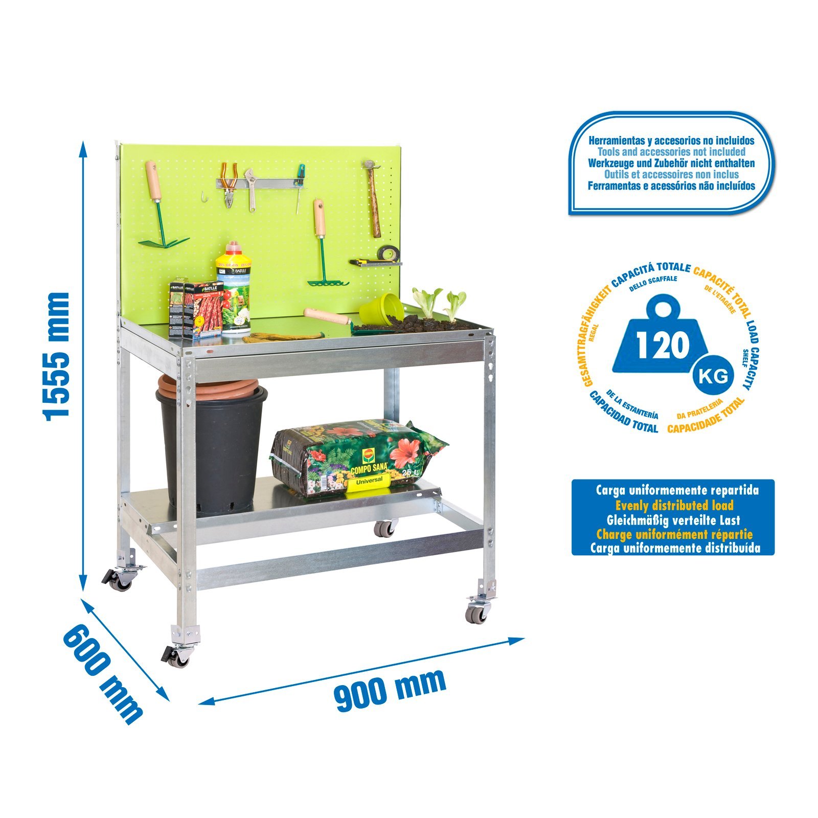 Banco de trabajo para jardin. No necesita anclaje a la pared. Es un banco de trabajo con un panel donde colocar herramientas y accesorios para una mejor organizacion del banco de trabajo. Tiene un grosor de MDF de 16 mm (0. 6). Al llevar ruedas su capacidad de carga es de 120 kgs en total de forma uniformemente repartida. Nuevo packaging en caja. Montaje sin tornillos. Color del producto VERDE/GALVANIZADO. Dimensiones 1440x900x600. N estantes 2