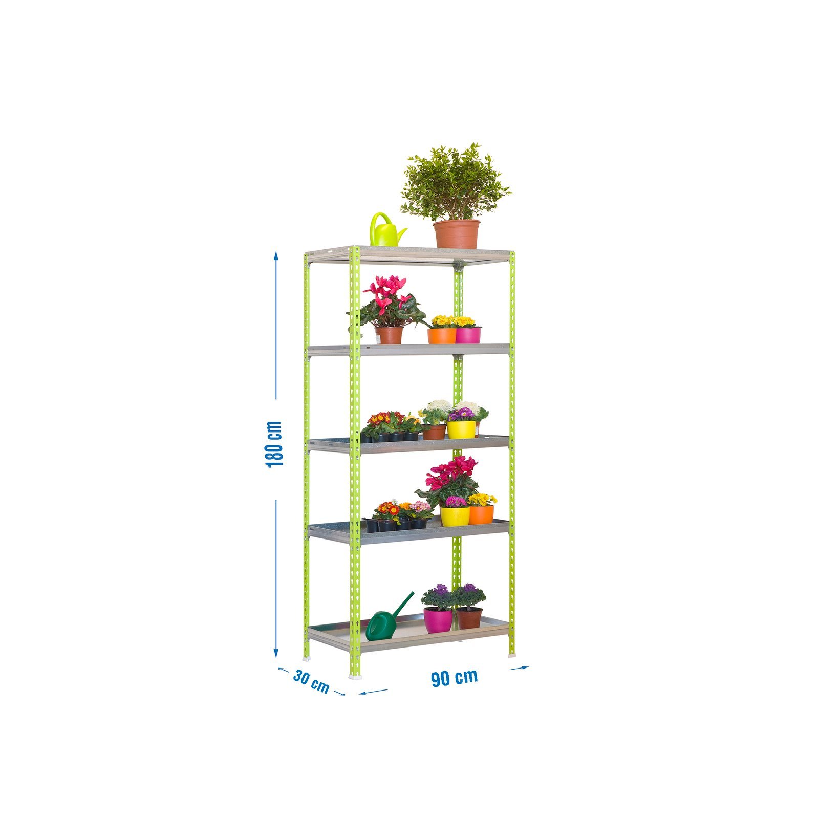 Estanteria metalica sin tornillos ideal para jardin. Montaje facil y rapido sin tornillos, en unos minutos puedes tener la estanteria montada. Tiene 5 estantes, cada uno de ellos soporta hasta 100 kg, capacidad de carga certificada a punto de flexion, no de rotura. . Incluye bandejas perforadas para que se filtre el agua. Incluye una bandeja lisa para contener el agua. Manipulacion sin riesgo, sin aristas de corte. Producto fabricado en Europa por Simonrack. Medidas en uso del producto, 1749x910x310 mm