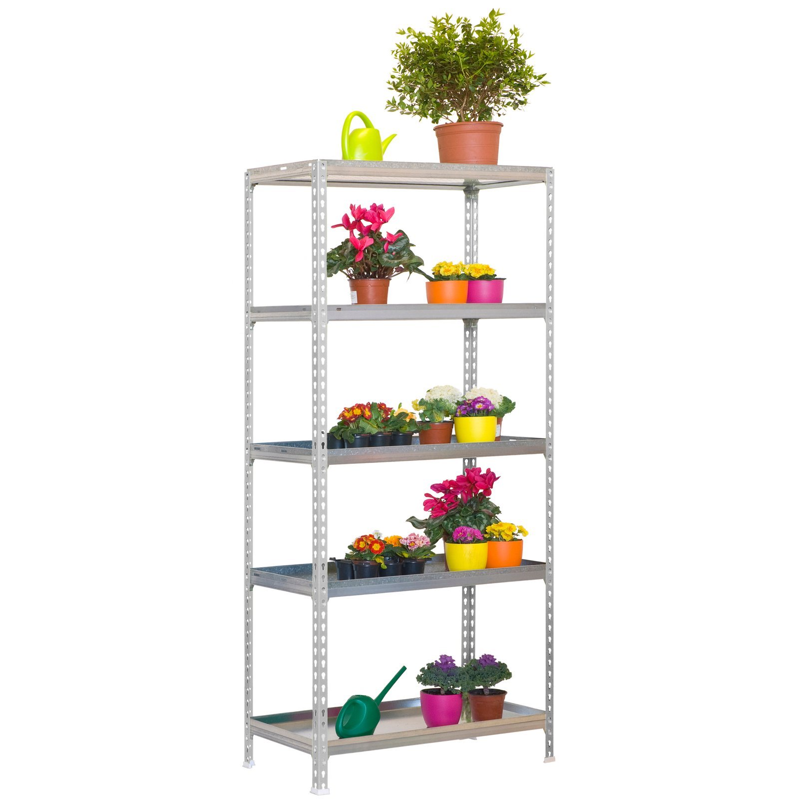 Estanteria metalica sin tornillos ideal para jardin. Montaje facil y rapido sin tornillos, en unos minutos puedes tener la estanteria montada. Tiene 5 estantes, cada uno de ellos soporta hasta 100 kg, capacidad de carga certificada a punto de flexion, no de rotura. . Incluye bandejas perforadas para que se filtre el agua. Incluye una bandeja lisa para contener el agua. Manipulacion sin riesgo, sin aristas de corte. Producto fabricado en Europa por Simonrack. Medidas en uso del producto, 1749x910x410 mm