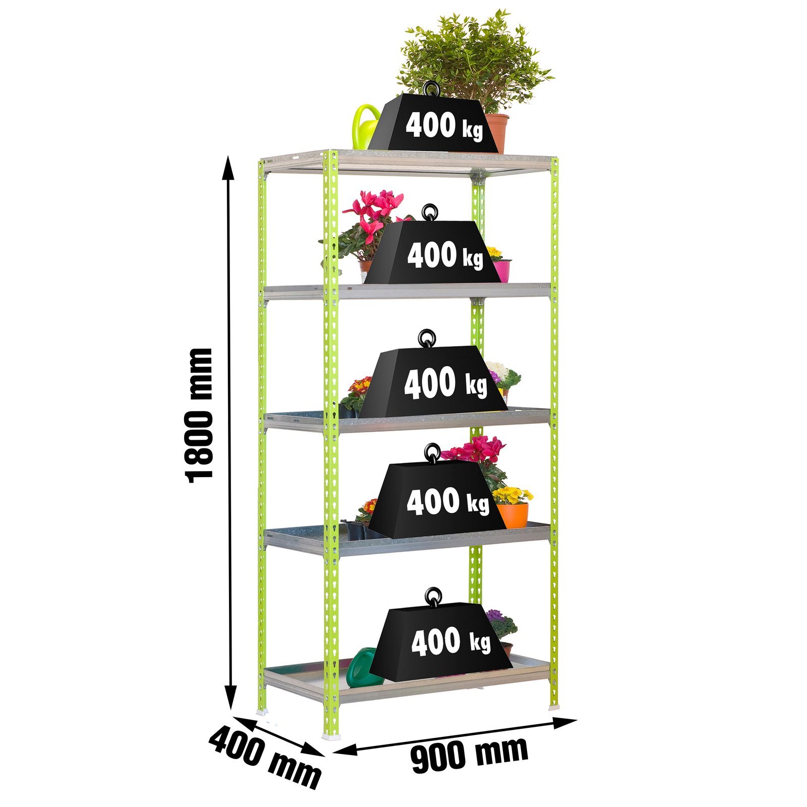 Estanteria metalica sin tornillos ideal para jardin. Montaje facil y rapido sin tornillos, en unos minutos puedes tener la estanteria montada. Tiene 5 estantes, cada uno de ellos soporta hasta 100 kg, capacidad de carga certificada a punto de flexion, no de rotura. . Incluye bandejas perforadas para que se filtre el agua. Incluye una bandeja lisa para contener el agua. Manipulacion sin riesgo, sin aristas de corte. Producto fabricado en Europa por Simonrack. Medidas en uso del producto, 1749x910x410 mm