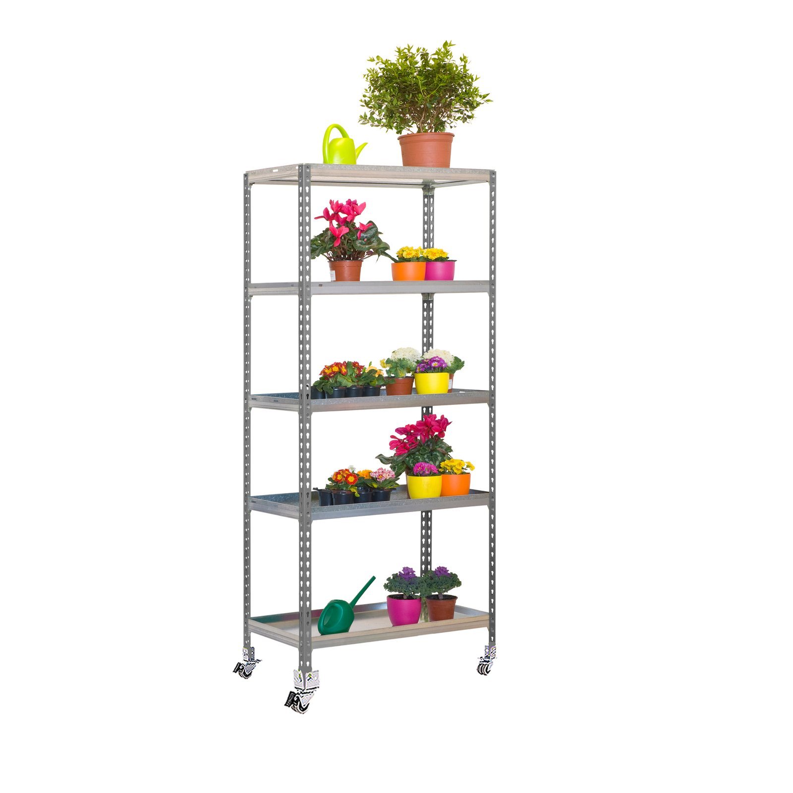 Estanteria metalica sin tornillos que incluye ruedas, al llevar insertadas las ruedas la capacidad de carga de la estanteria es de 120 kgs en total. Capacidad de carga certificada a punto de flexion, no de rotura. Montaje en unos minutos. Permite alojar las bandejas en 2 posiciones ya que tienen perforaciones para dejar pasar el agua -Permite modificar la ubicacion en altura de las bandejas de forma sencilla sin necesidad de desmontar la estanteria. facil insercion de accesorios como el Panelclick. Color del producto GRIS/GALVANIZADO. Dimensiones 1800x900x400. N estantes 5. Producto fabricado en Europa por Simonrack