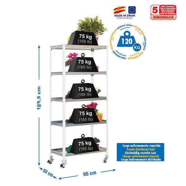 Estanteria metalica sin tornillos con bandeja metalica, de color BLANCO/GALVA. Tiene 5 estantes. Las dimensiones de esta estanteria son, 1800x900x500 mm. Y tiene una capacidad de carga de 120 kgs en total al llevar incluidas las ruedas. Es el unico sistema de ordenacion del mundo que puede colocar las bandejas en 3 posiciones diferentes, recta o estandar, inclinada y contenedora. Es fabricado en Europa por Simonrack y se monta rapido siguiendo las instrucciones