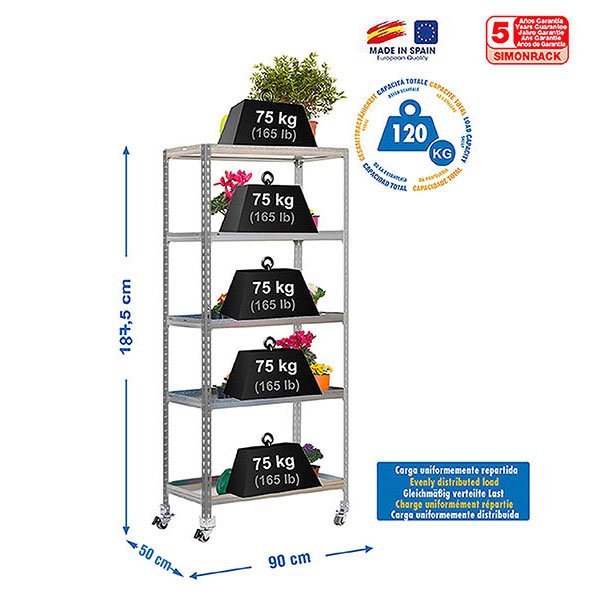 Estanteria metalica sin tornillos que incluye ruedas, al llevar insertadas las ruedas la capacidad de carga de la estanteria es de 120 kgs en total. Capacidad de carga certificada a punto de flexion, no de rotura. Montaje en unos minutos. Permite alojar las bandejas en 2 posiciones ya que tienen perforaciones para dejar pasar el agua -Permite modificar la ubicacion en altura de las bandejas de forma sencilla sin necesidad de desmontar la estanteria. facil insercion de accesorios como el Panelclick. Color del producto GRIS/GALVANIZADO. Dimensiones 1800x900x500. N estantes 5. Producto fabricado en Europa por Simonrack