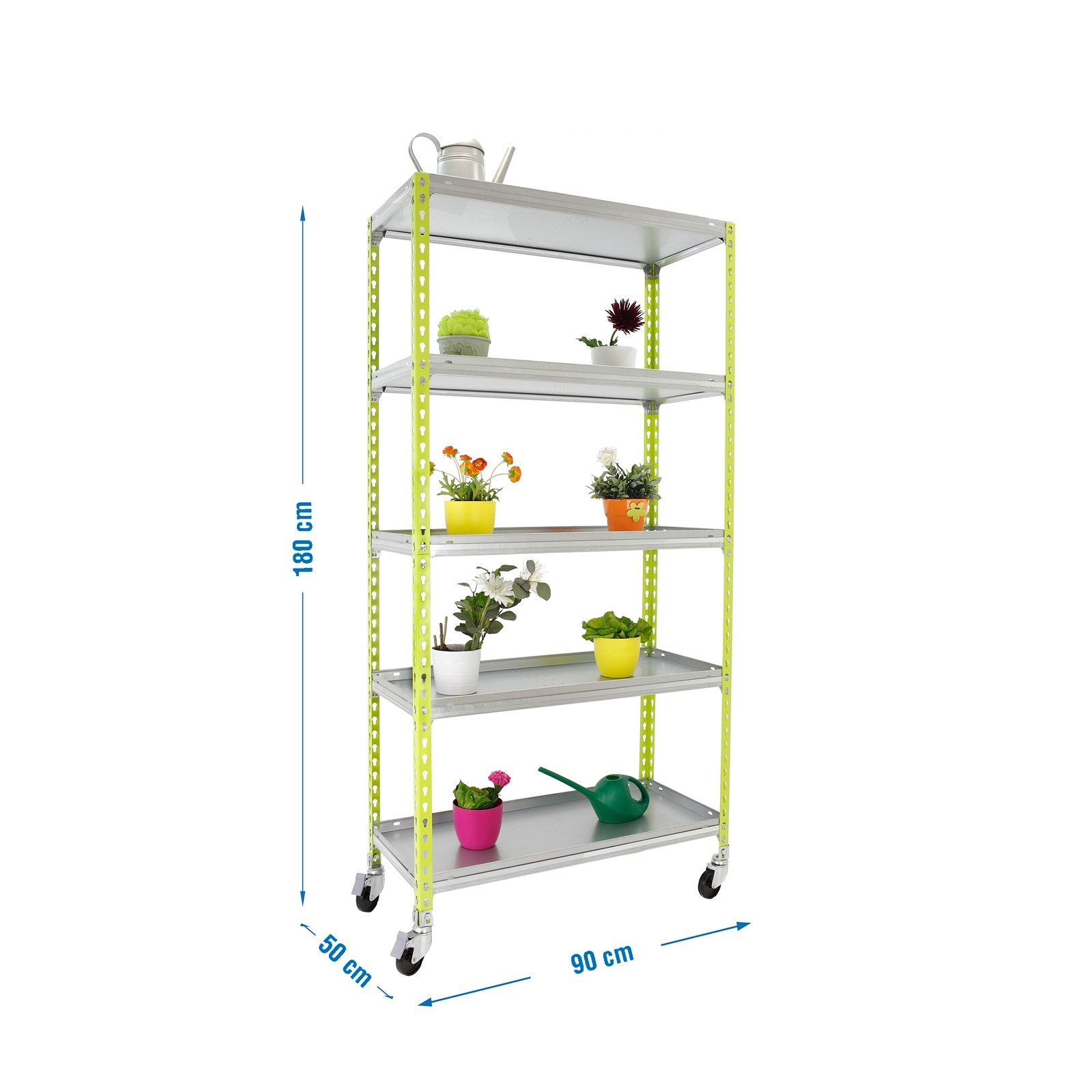 Estanteria metalica sin tornillos, de color VERDE/GALVANIZADO. Tiene 5 estantes. Las dimensiones de esta estanteria son, 1800x900x500 mm. Tiene una capacidad de carga de 120 kgs en total al llevar insertadas las ruedas. Incluye ruedas. Incluye bandejas perforadas para que se filtre el agua. Incluye una bandeja lisa para contener el agua. Es fabricado en Europa por Simonrack y se monta rapido siguiendo las instrucciones