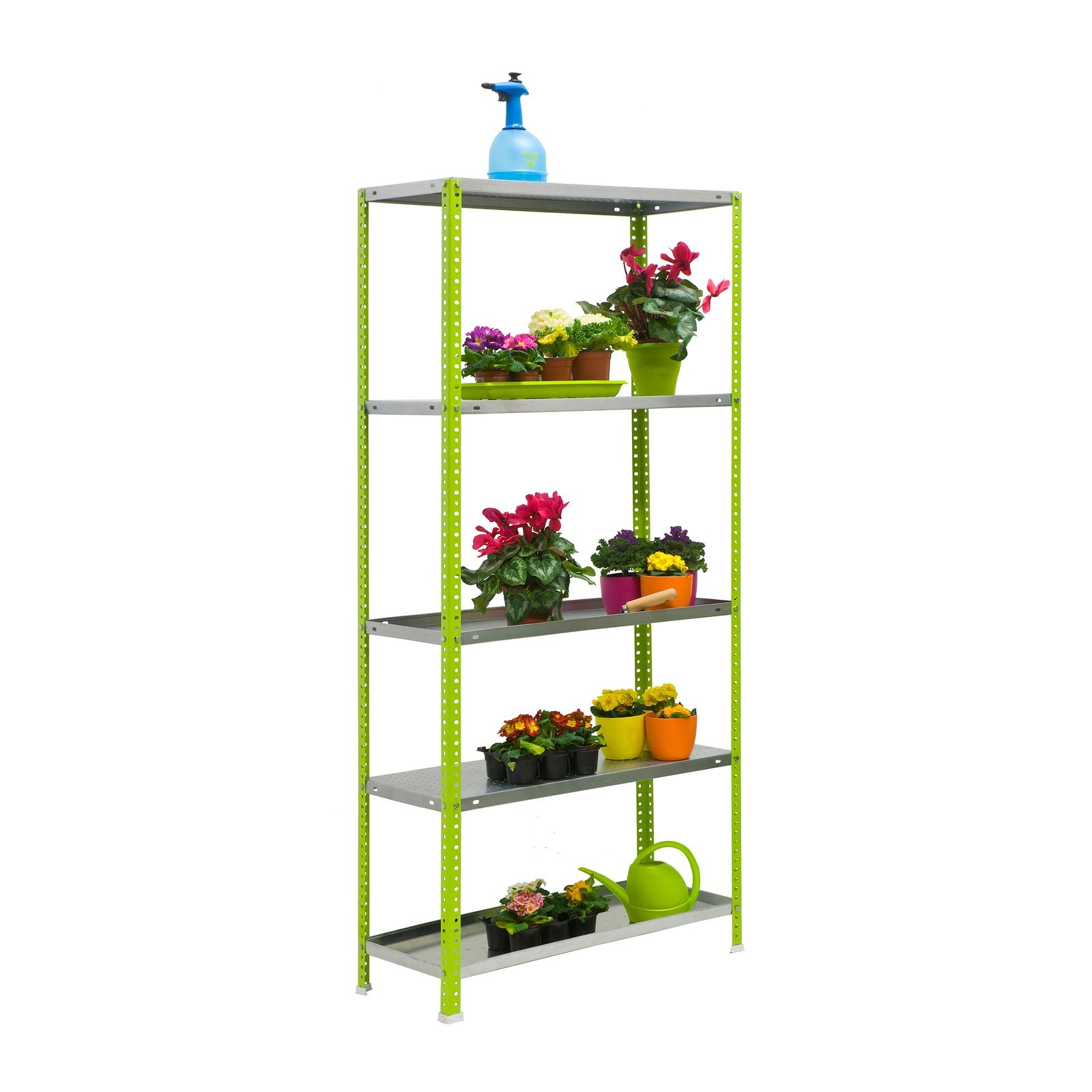 Estanteria metalica con tornillos ideal para jardin. Montaje facil siguiendo las instrucciones, en unos minutos puedes tener la estanteria montada. Tiene 5 estantes, cada uno de ellos soporta hasta 100 kg. Incluye bandejas perforadas para que se filtre el agua. Incluye una bandeja lisa para contener el agua. Manipulacion sin riesgo, sin aristas de corte. Producto fabricado en Europa por Simonrack. Medidas en uso del producto, 1800x910x410 mm