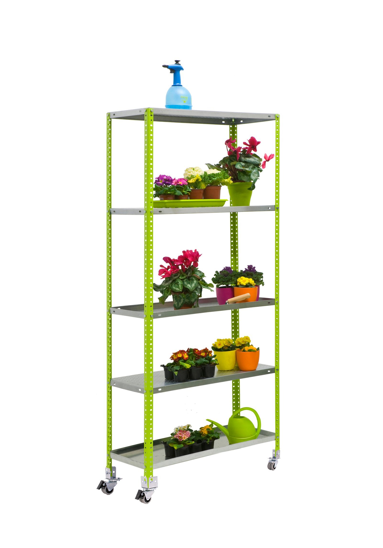 Estanteria metalica con tornillos. Tiene una capacidad de carga de 120 kgs en total al llevar insertadas las ruedas. Las bandejas disponen de perforaciones para dejar pasar el agua. No se tambalea. Admite ruedas. Opcion de poner las bandejas del reves. Color del producto VERDE/GALVANIZADO. Dimensiones 1800x900x300. N estantes 5