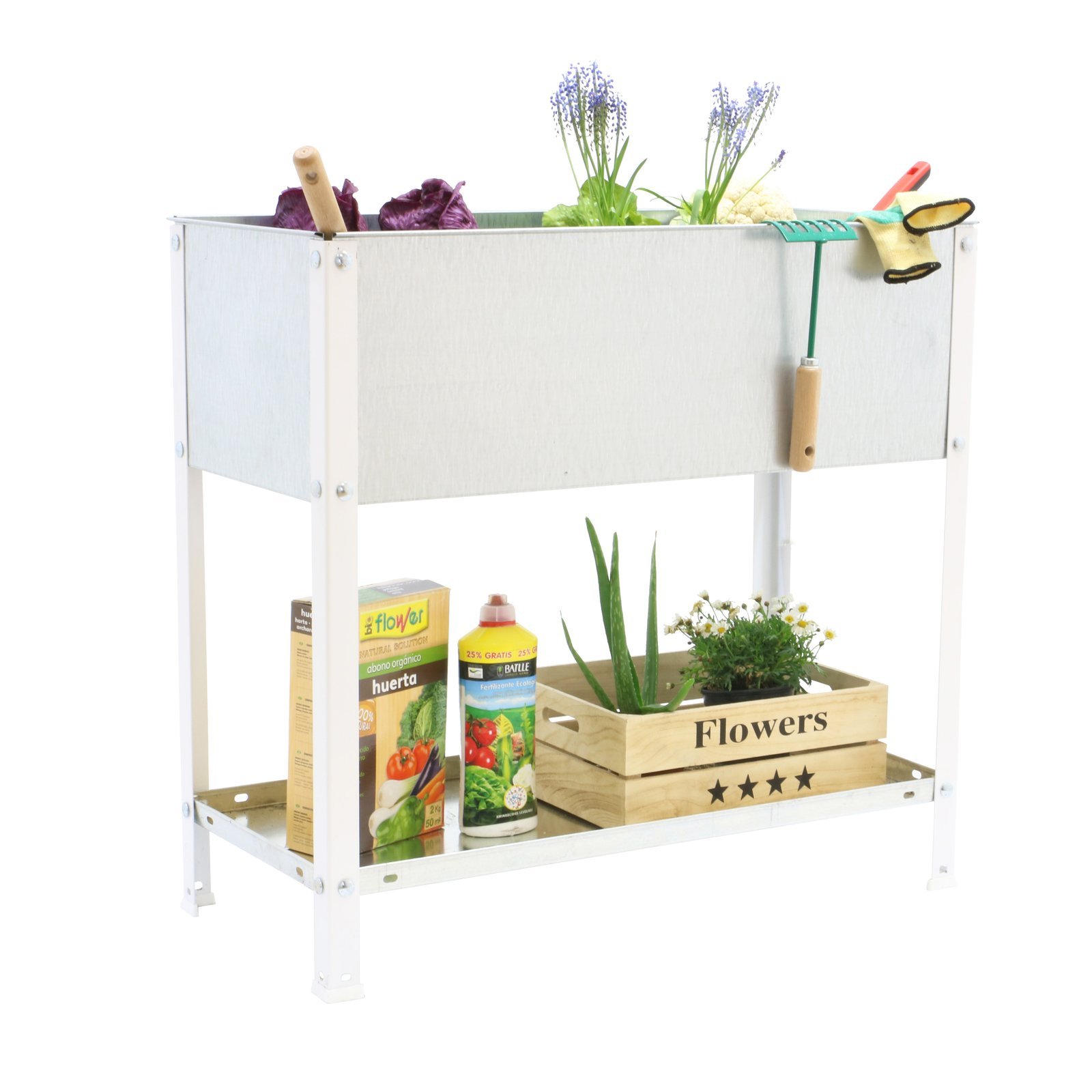 Huerto urbano metalico de color BLANCO/GALVA y medidas (alto x ancho x largo) 850x900x600 mm. Tiene una capacidad de 140 L, montaje facil con tornillos, no necesita anclaje a la pared. Hecho en Europa, calidad europea, puedes encontrar las instrucciones en el interior o en el siguiente enlace, https, //www. youtube. com/watch?v=NdqlmUNGjts. Medidas en uso del producto, 860x925x625 mm
