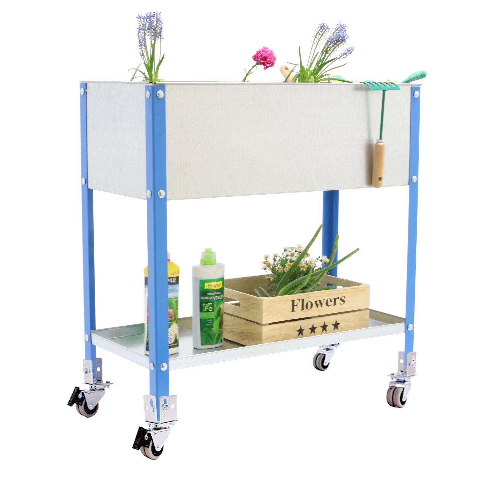 Huerto urbano metalico de color AZUL/GALVA y medidas (alto x ancho x largo) 925x1200x400 mm. Tiene una capacidad de 70 L, montaje facil con tornillos, no necesita anclaje a la pared. Hecho en Europa, calidad europea, puedes encontrar las instrucciones en el interior o en el siguiente enlace, https, //www. youtube. com/watch?v=NdqlmUNGjts. Medidas en uso del producto, 965x1225x425 mm
