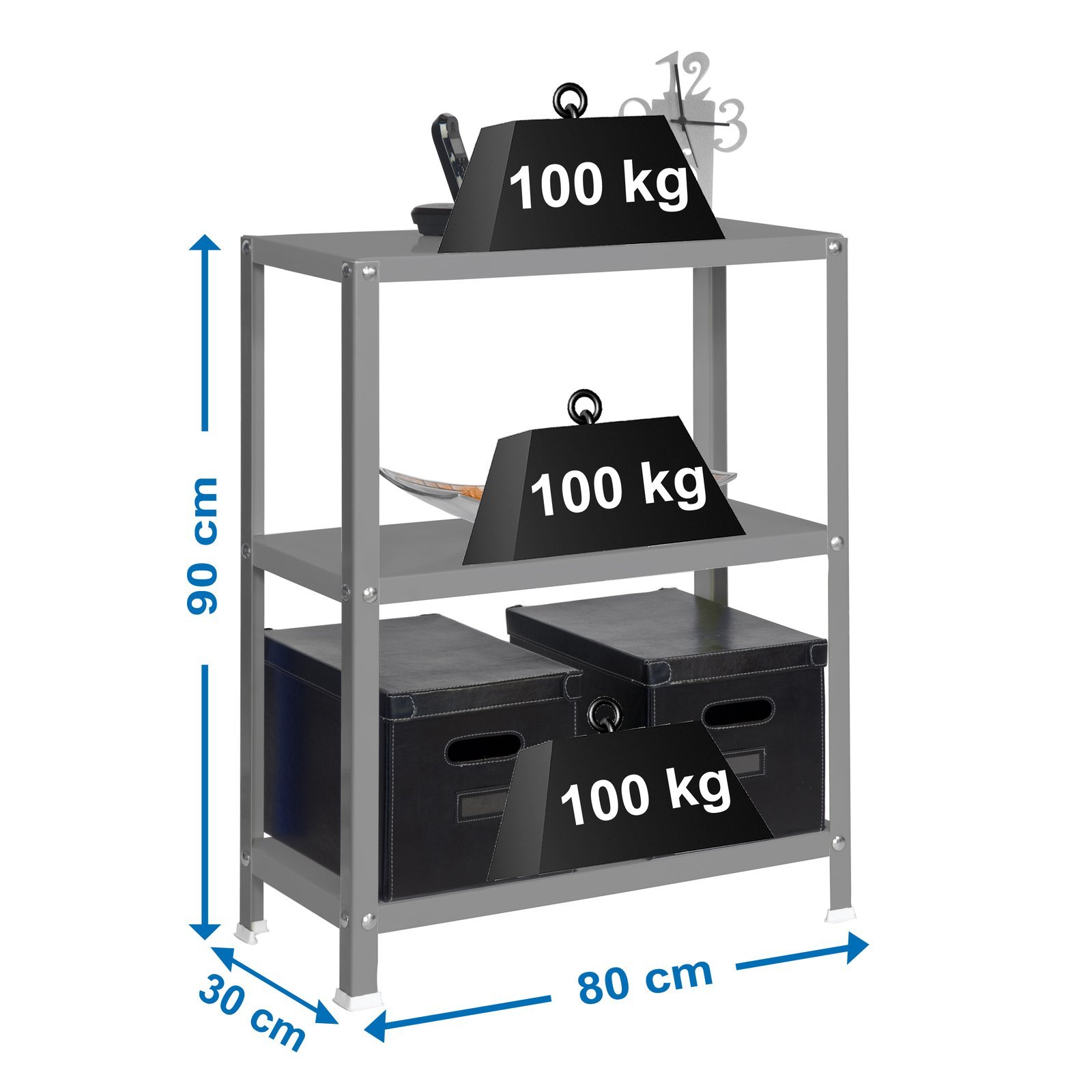 Estanteria metalica con tornillos avellanados con un mejor acabado y con bandejas metalicas. Montaje facil y rapido con tornillos. Estanteria con topes para no rayar el suelo. Ideal para cualquier rincon de la casa. Tiene 3 estantes y una capacidad de carga de 100 kg por bandeja metalica. Montaje en unos minutos. Packaging con peso ligero. Estanteria rigida, no se tambalea. No necesita anclaje a la pared. Producto fabricado en Europa por Simonrack. Medidas en uso del producto, 902x810x310 mm
