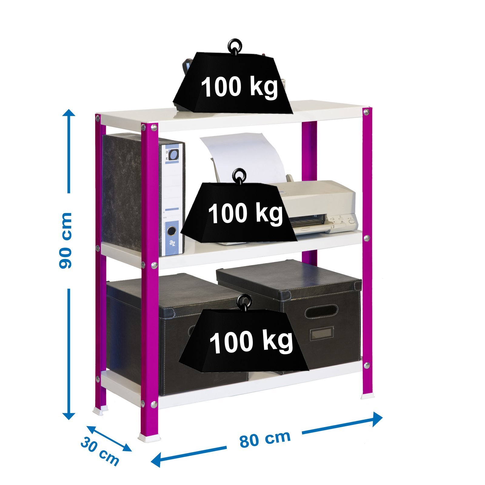 Estanteria metalica con tornillos de color ROSA/BLANCO con capacidad de carga por estante de 100 kg. El numero de estantes es 3 y las medidas (alto x ancho x fondo) son 900x800x300 mm. Ideal para cualquier habitacion, acabado hogare o. Producto europeo, calidad europea, podras encontrar las instrucciones de montaje en su interior. Medidas en uso del producto, 902x810x310 mm