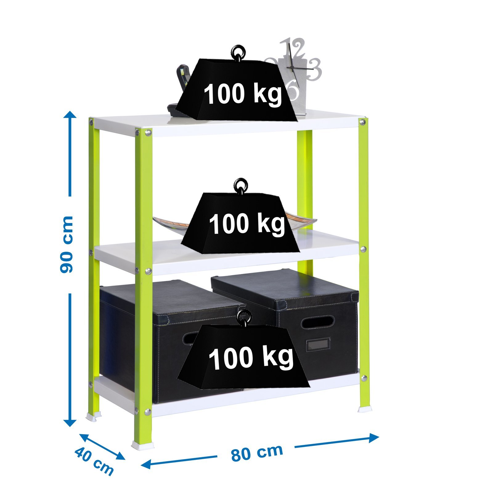 Estanteria metalica con tornillos avellanados con un mejor acabado y con bandejas metalicas. Montaje facil y rapido con tornillos. Estanteria con topes para no rayar el suelo. Ideal para cualquier rincon de la casa. Tiene 3 estantes y una capacidad de carga de 100 kg por bandeja metalica. Montaje en unos minutos. Packaging con peso ligero. Estanteria rigida, no se tambalea. No necesita anclaje a la pared. Producto fabricado en Europa por Simonrack. Medidas en uso del producto, 902x810x410 mm