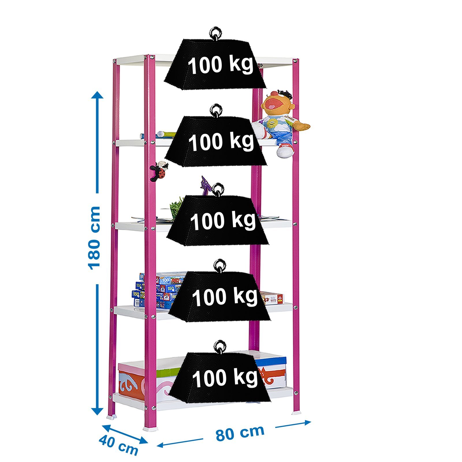 Estanteria metalica con tornillos de color ROSA/BLANCO con capacidad de carga por estante de 100 kg. El numero de estantes es 5 y las medidas (alto x ancho x fondo) son 1800x800x400 mm. Ideal para cualquier habitacion, acabado hogare o. Producto europeo, calidad europea, podras encontrar las instrucciones de montaje en su interior. Medidas en uso del producto, 1802x810x410 mm