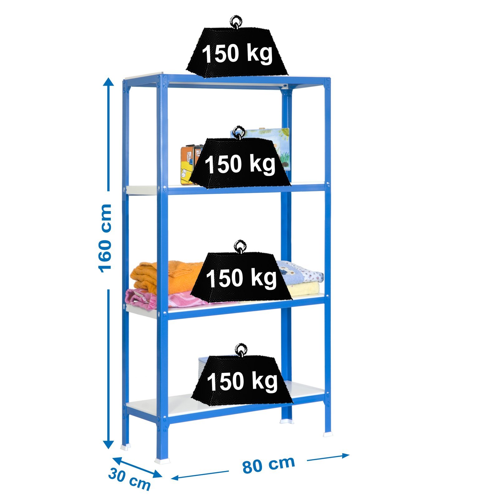 Estanteria metalica sin tornillos de color AZUL/BLANCO con medidas (alto x ancho x largo) 1600x800x300 mm. Tiene 4 estantes y una capacidad de carga por estante de 150 kg. Los estantes tienen altura regulable y las bandejas son faciles de limpiar. Hecho en Europa, calidad europea, puedes encontrar las instrucciones en el interior o en el siguiente enlace, https, //www. youtube. com/watch?v=Rx91Gq2vy1A. Medidas en uso del producto, 1602x810x310 mm