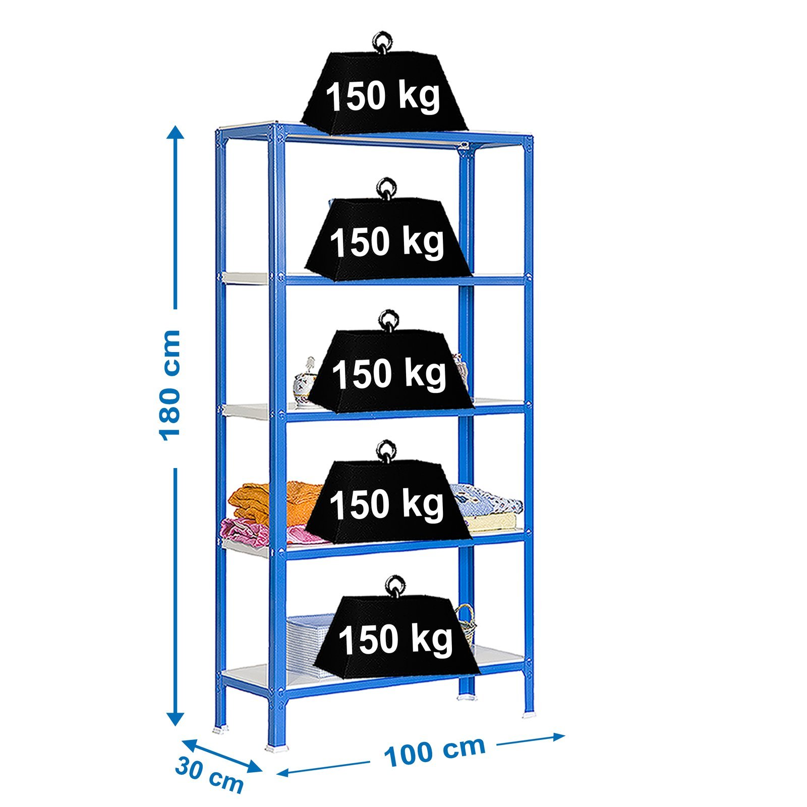 Estanteria metalica sin tornillos de color AZUL/BLANCO con medidas (alto x ancho x largo) 1800x1000x300 mm. Tiene 5 estantes y una capacidad de carga por estante de 150 kg. Los estantes tienen altura regulable y las bandejas son faciles de limpiar. Hecho en Europa, calidad europea, puedes encontrar las instrucciones en el interior o en el siguiente enlace, https, //www. youtube. com/watch?v=Rx91Gq2vy1A. Medidas en uso del producto, 1802x1100x310 mm