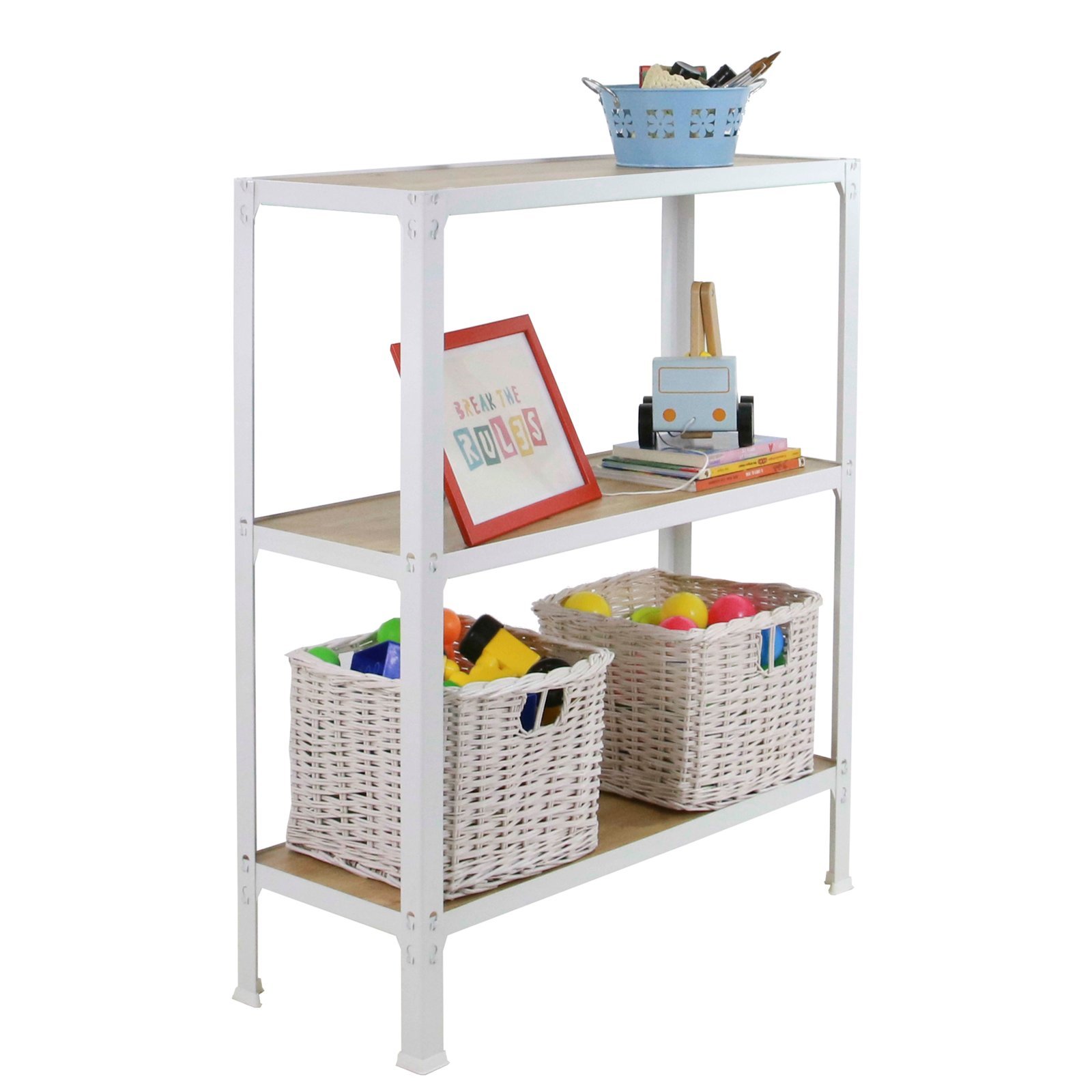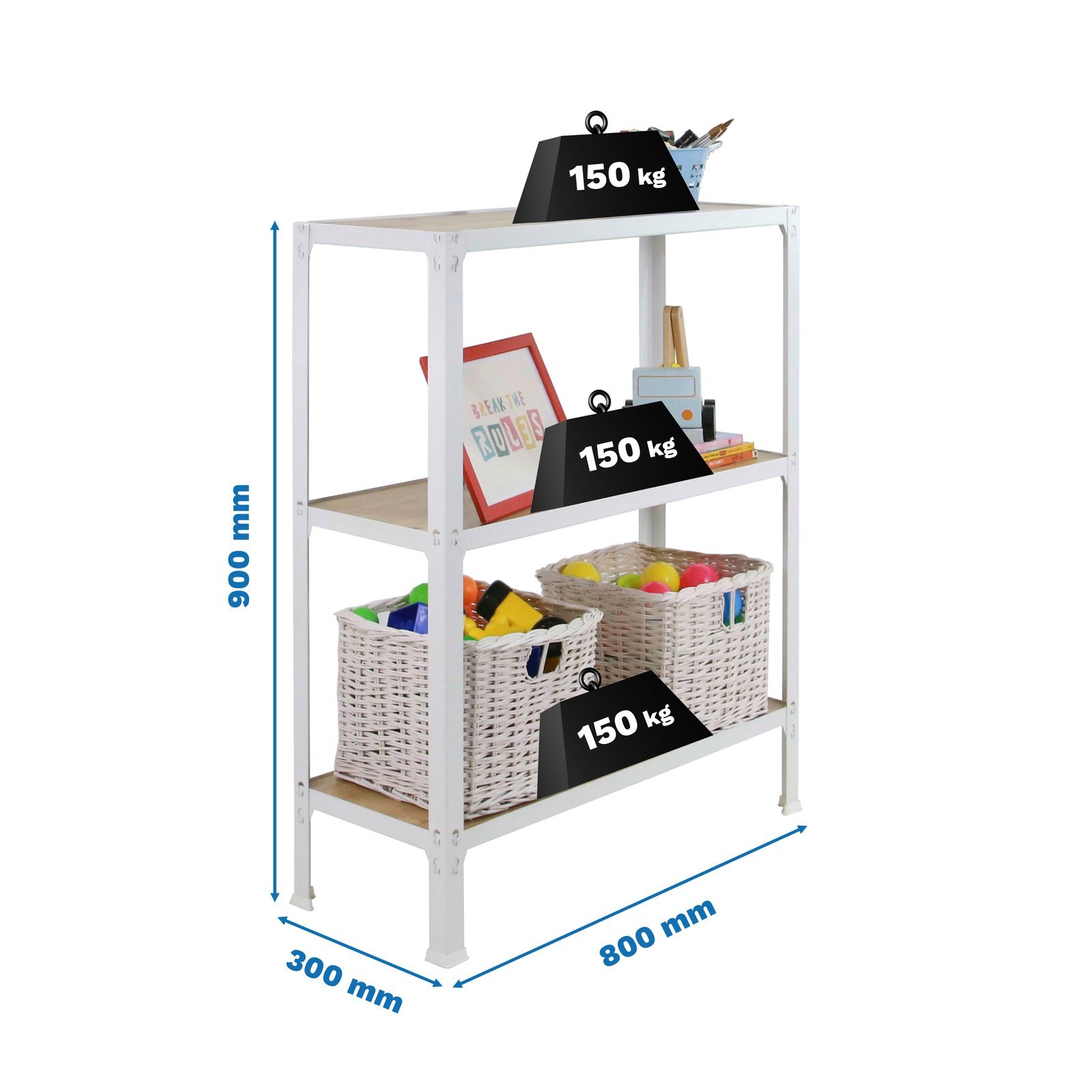 Estanteria metalica sin tornillos de color BLANCO/ROBLE con medidas (alto x ancho x largo) 900x800x300 mm. Las bandejas son de madera contrachapada de color roble. Tiene 3 estantes y una capacidad de carga por estante de 150 kg. Los estantes tienen altura regulable y las bandejas son faciles de limpiar. fabricado en Europa por Simonrack, calidad europea, puedes encontrar las instrucciones en el interior