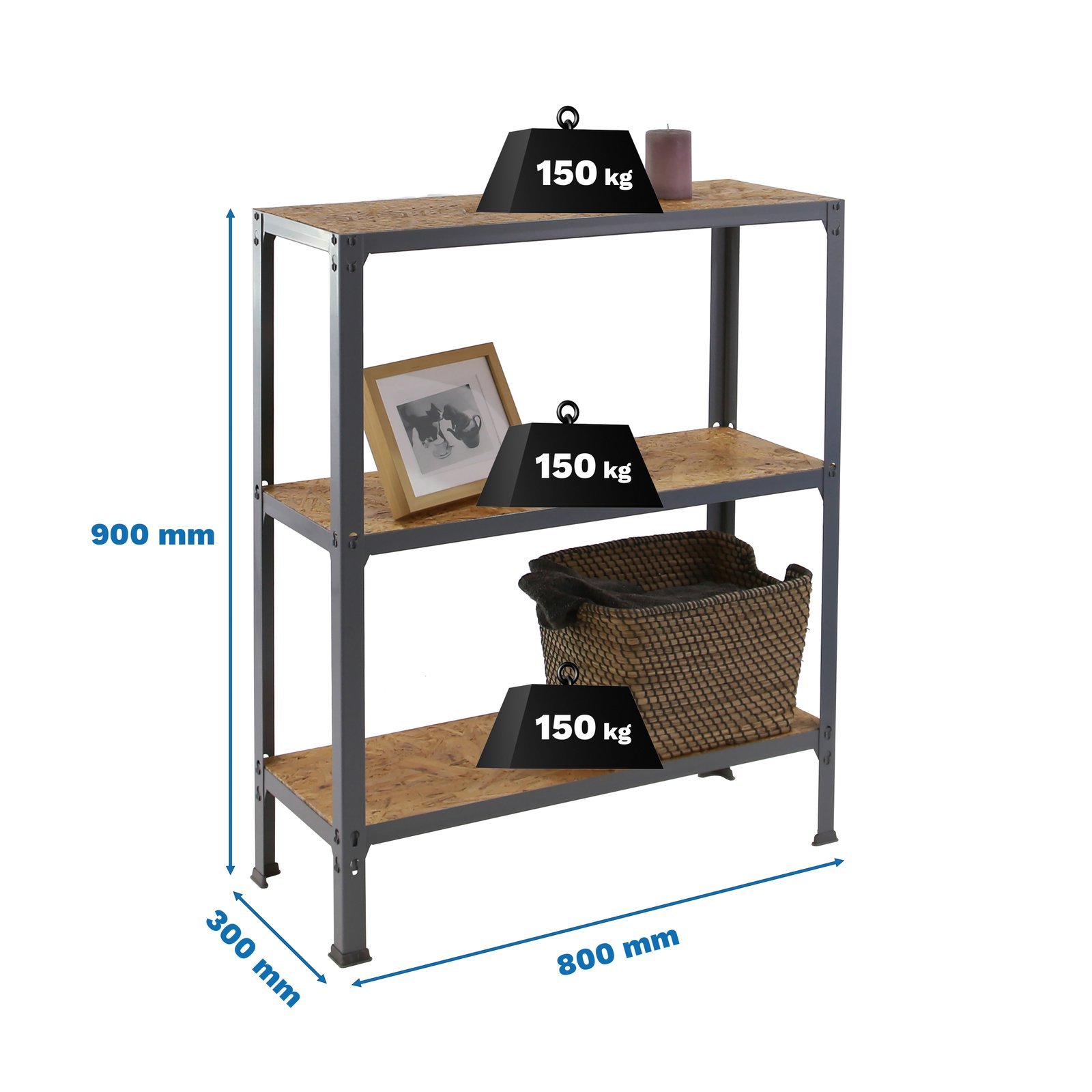 Estanteria metalica sin tornillos y con bandejas de madera OSB, ideal para el hogar. Sistema de montaje facil y rapido. Montaje en unos minutos. Color del producto GRIS/OSB. La bandeja de OSB ofrece una alta resistencia, no tiene nudos, huecos u otros tipos de puntos debiles como pueden tener las bandejas contrachapadas, ademas resiste a la humedad y actua como aislante termico. Tiene 3 estantes. Las dimensiones de esta estanteria son (alto x ancho x fondo), 900x800x300 mm. Es rigida y tiene recubrimiento Epoxypoliester antirayaduras e innifugo. No necesita anclaje a la pared. Se pueden ajustar sus estantes en altura y combinarlos como se desee. Estanteria con 4 pies para no rayar el suelo. Capacidad de carga de 150 kgs por estante, certificada a punto de flexion. Packaging con peso ligero. Disponible en otros colores. Producto fabricado en Europa por Simonrack