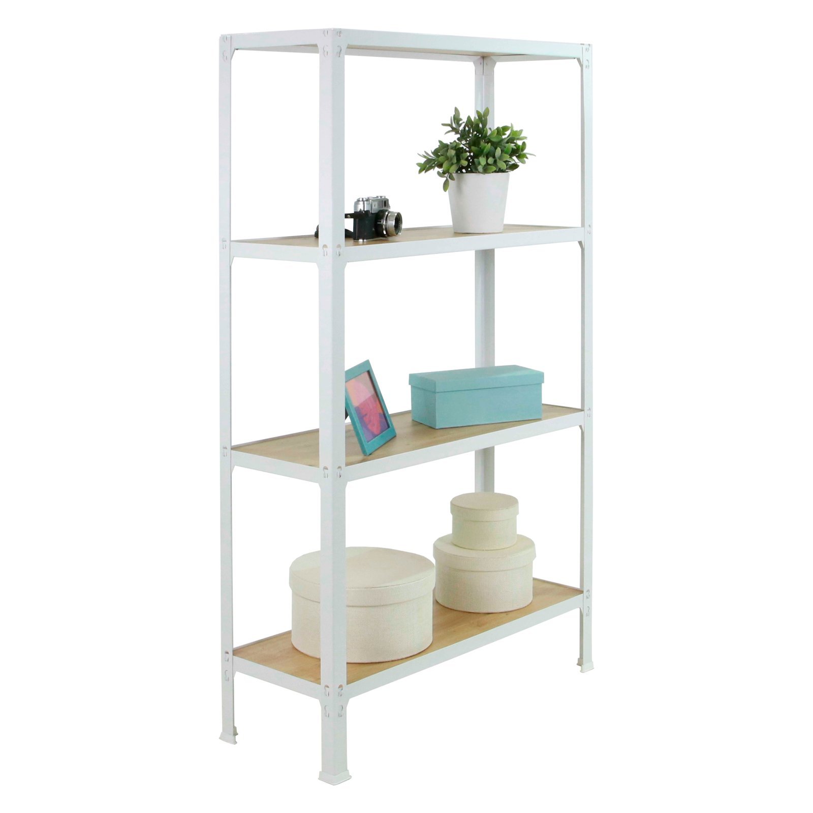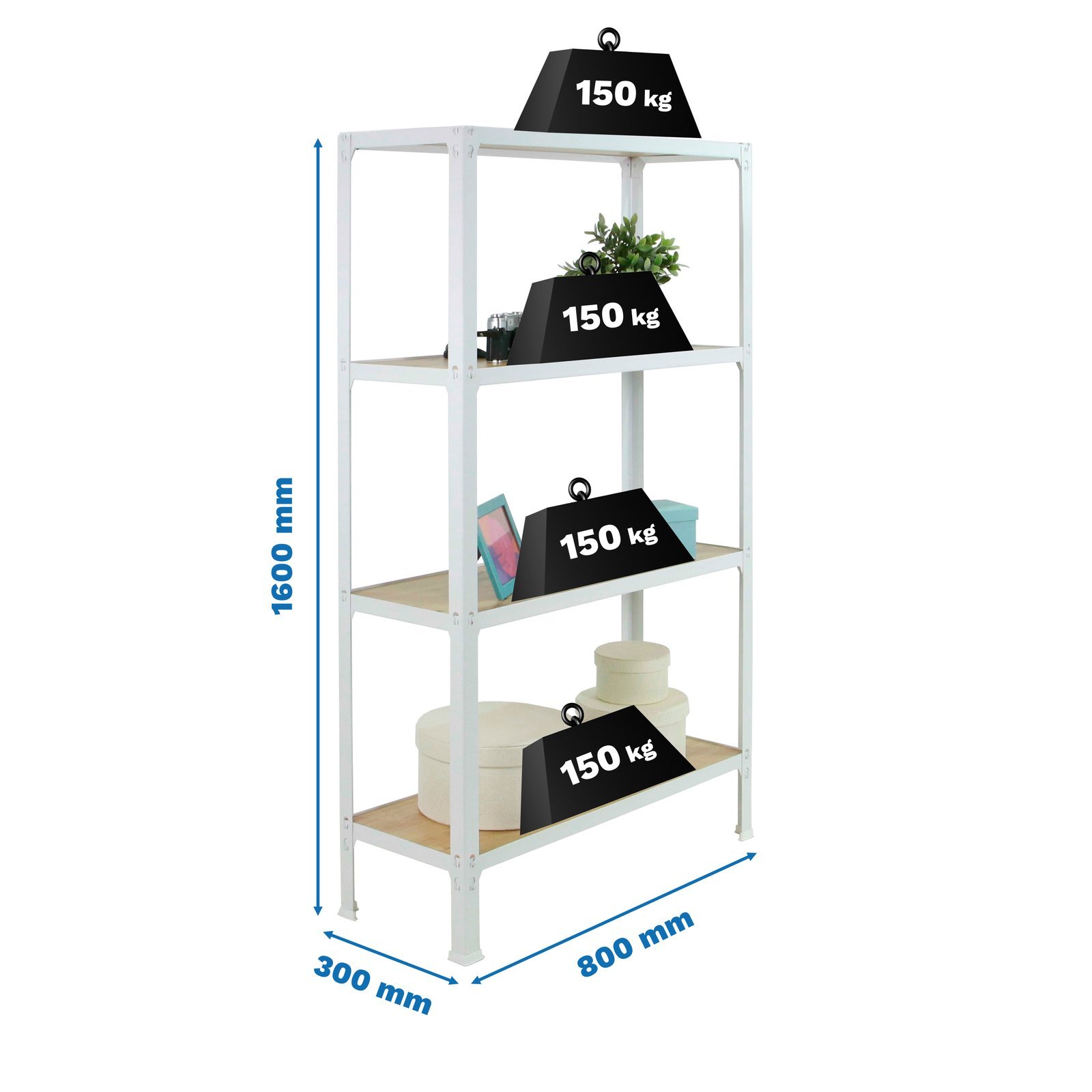 Estanteria metalica sin tornillos de color BLANCO/ROBLE con medidas (alto x ancho x largo) 1600x800x300 mm. Las bandejas son de madera contrachapada de color roble. Tiene 4 estantes y una capacidad de carga por estante de 150 kg. Los estantes tienen altura regulable y las bandejas son faciles de limpiar. fabricado en Europa por Simonrack, calidad europea, puedes encontrar las instrucciones en el interior