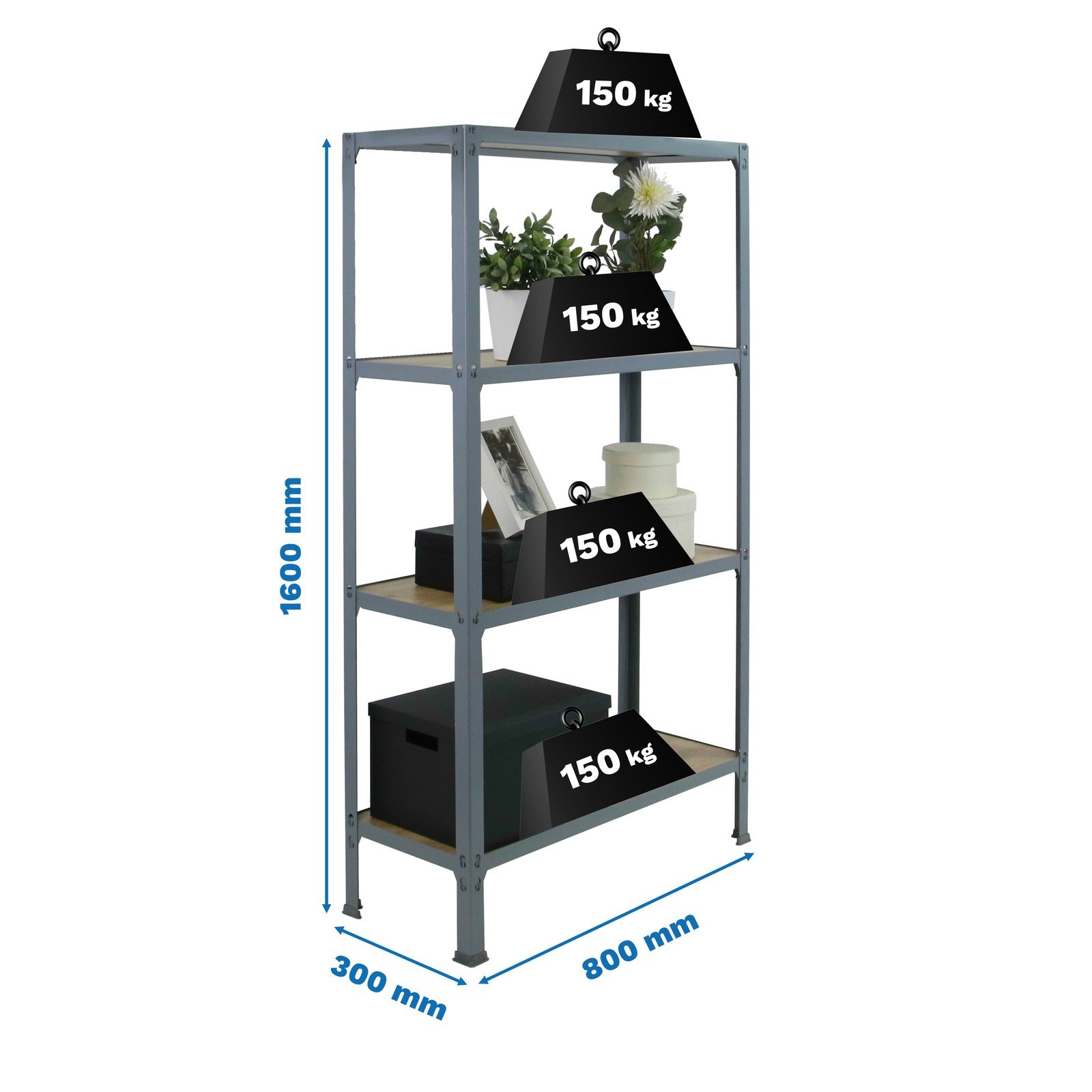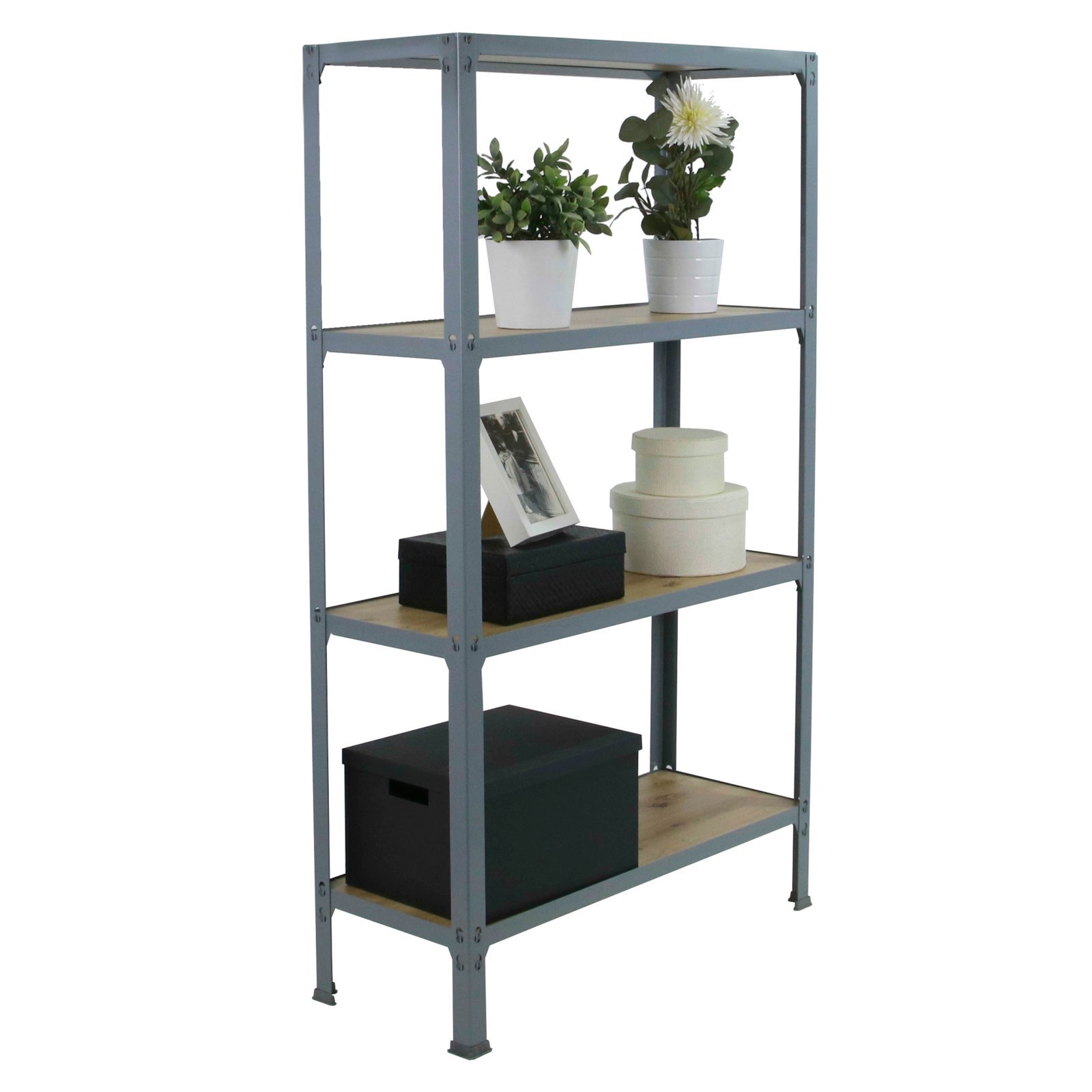 Estanteria metalica sin tornillos de color GRIS/ROBLE con medidas (alto x ancho x largo) 1600x800x300 mm. Las bandejas son de madera contrachapada de color roble. Tiene 4 estantes y una capacidad de carga por estante de 150 kg. Los estantes tienen altura regulable y las bandejas son faciles de limpiar. fabricado en Europa por Simonrack, calidad europea, puedes encontrar las instrucciones en el interior